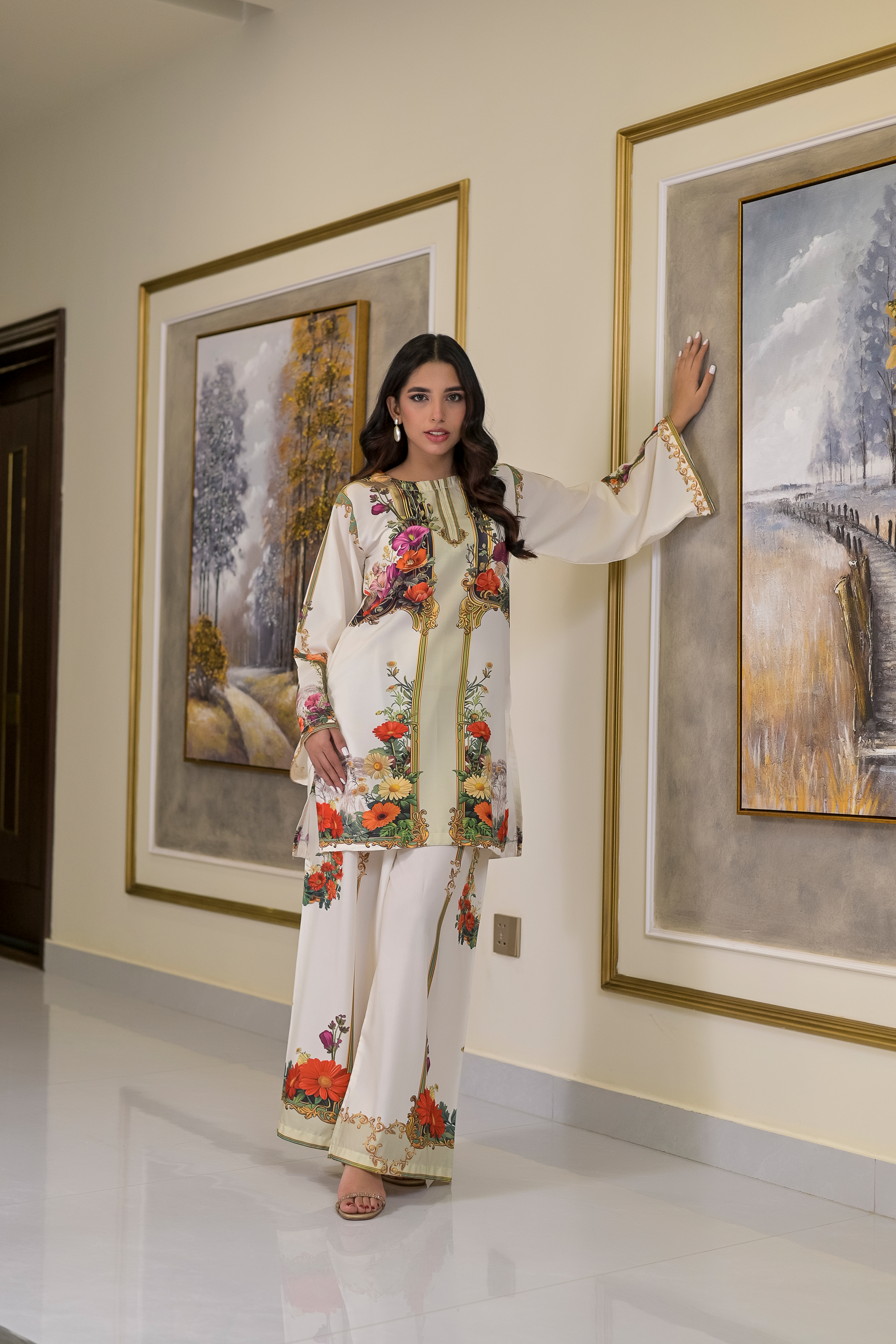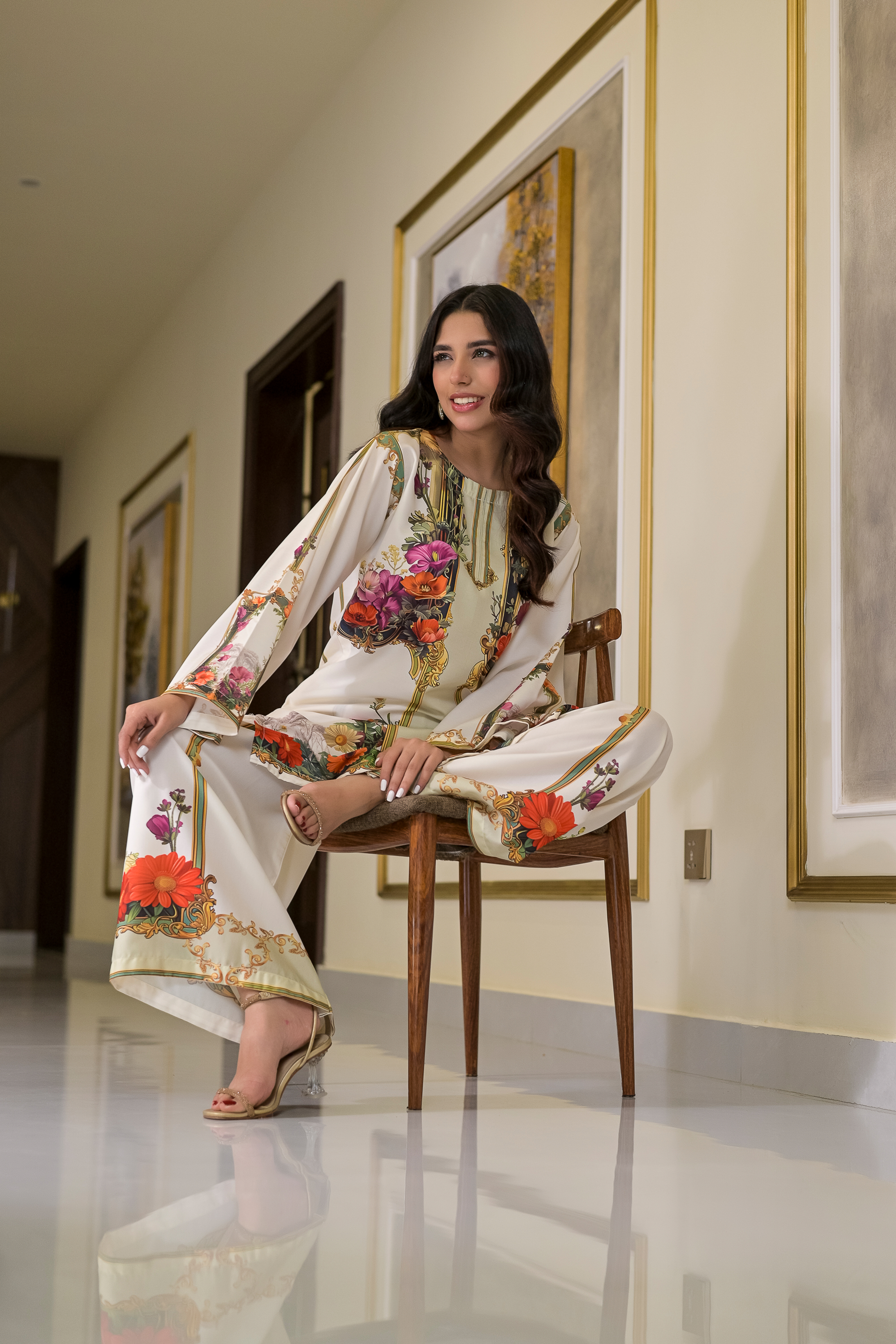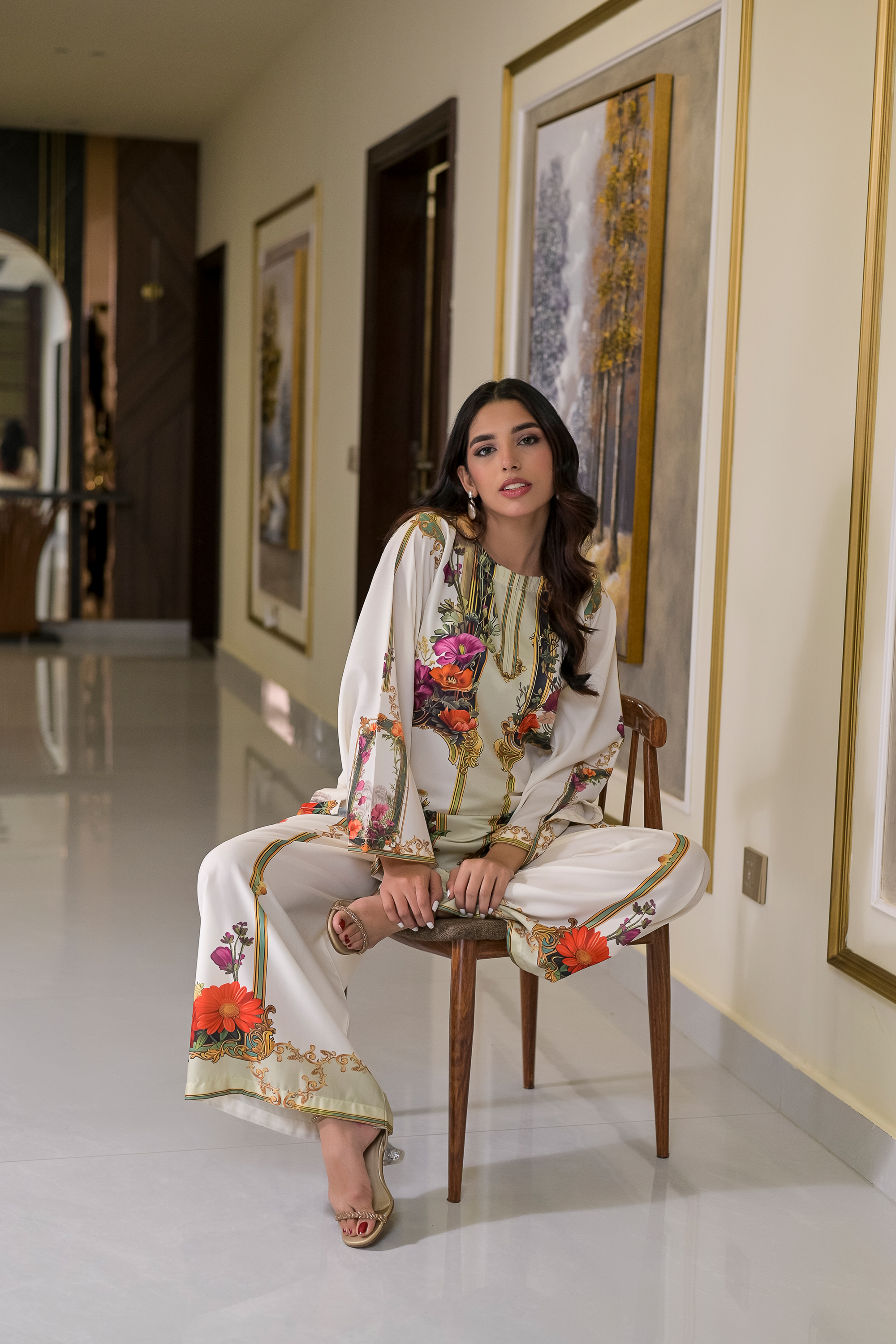 Amber Rose brings elegance and vibrance together with its soft cream base elevated by rich amber, coral, and rose-toned accents. Crafted from lightweight blended raw silk, this 2-piece stitched set features a straight-cut shirt with wide sleeves and matching trousers detailed with vibrant borders. Refined yet lively—perfect for brightening your everyday style with a graceful statement.
