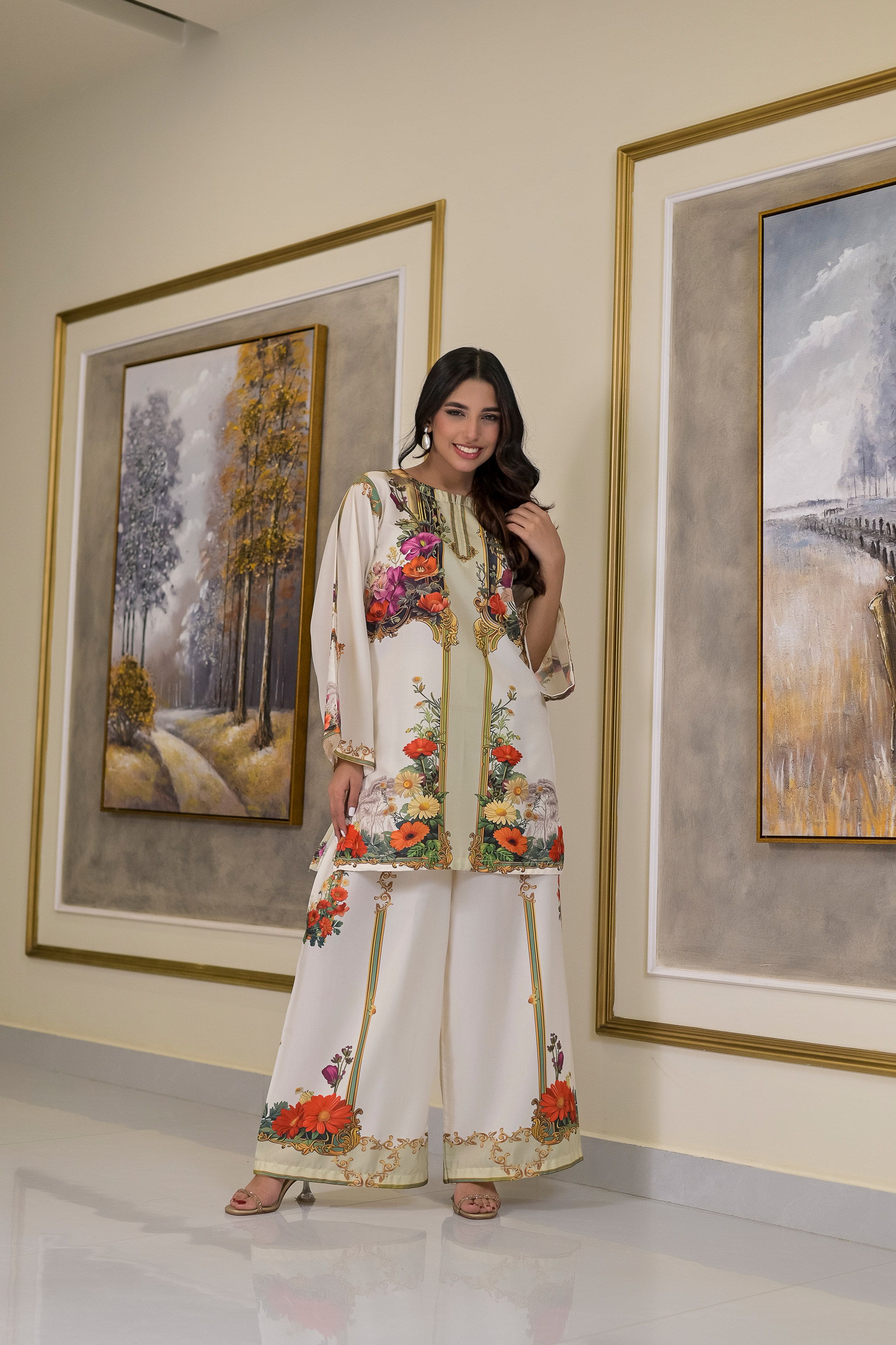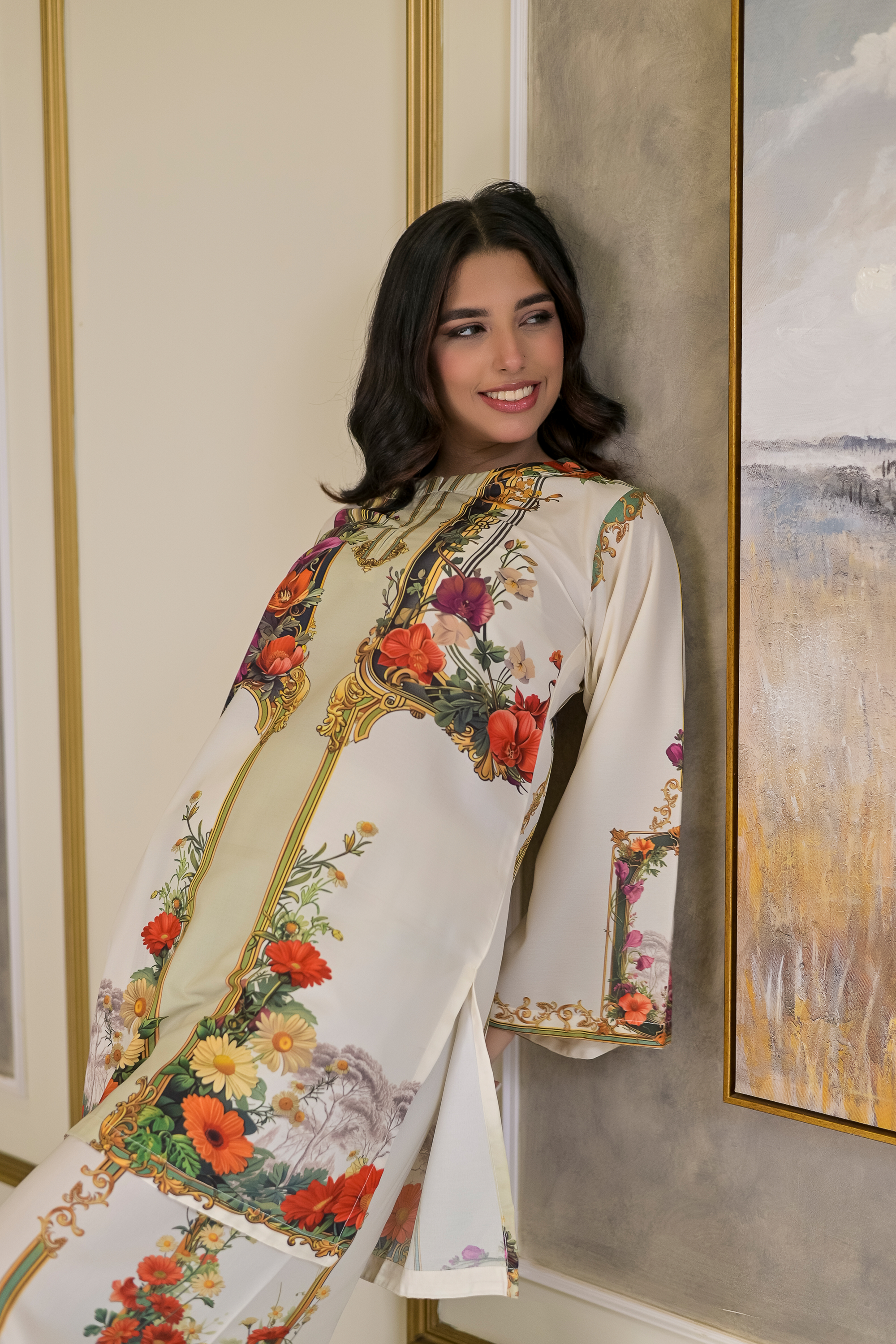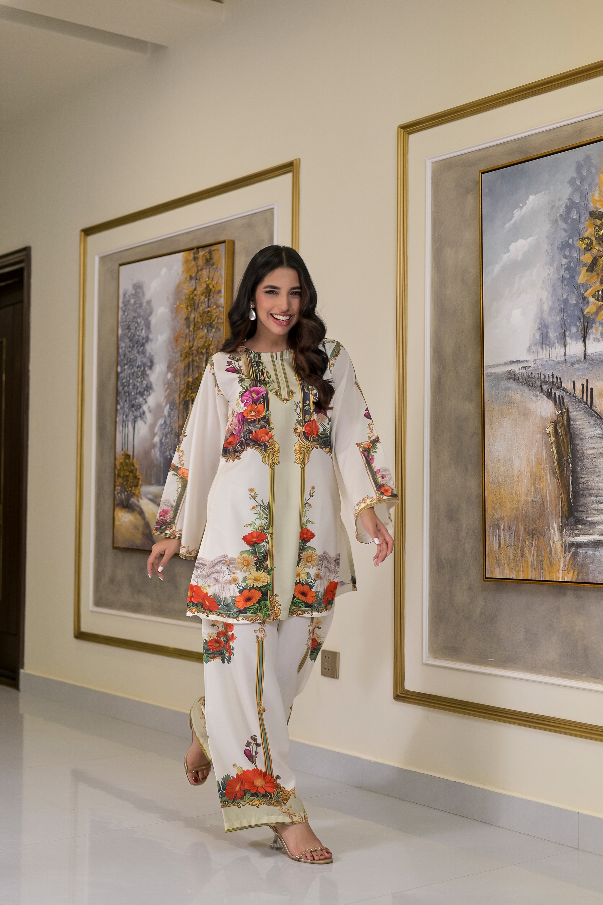 Amber Rose brings elegance and vibrance together with its soft cream base elevated by rich amber, coral, and rose-toned accents. Crafted from lightweight blended raw silk, this 2-piece stitched set features a straight-cut shirt with wide sleeves and matching trousers detailed with vibrant borders. Refined yet lively—perfect for brightening your everyday style with a graceful statement.