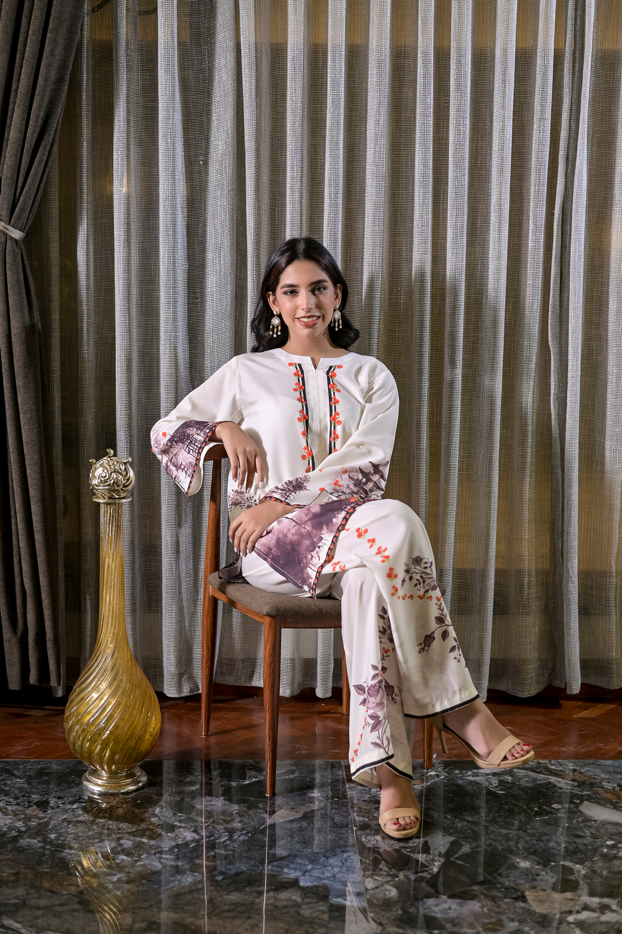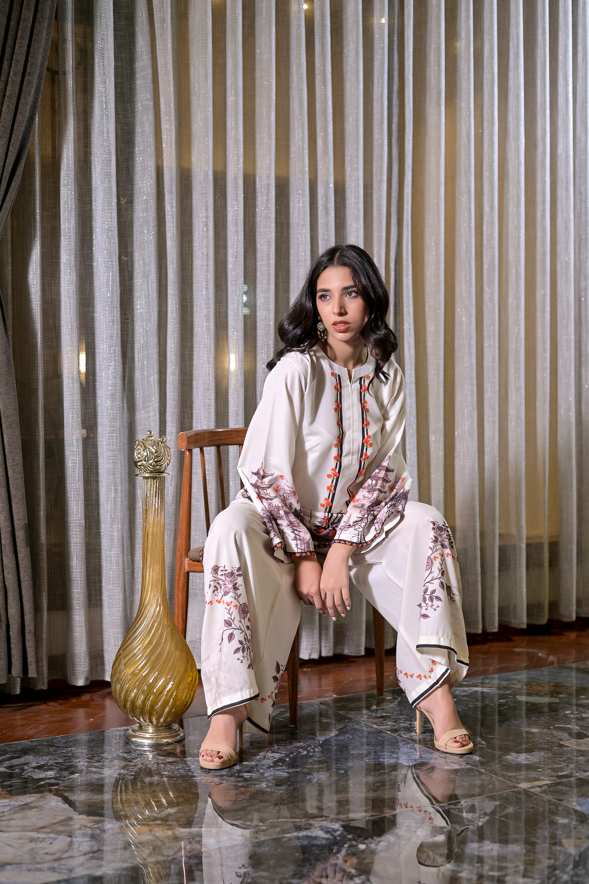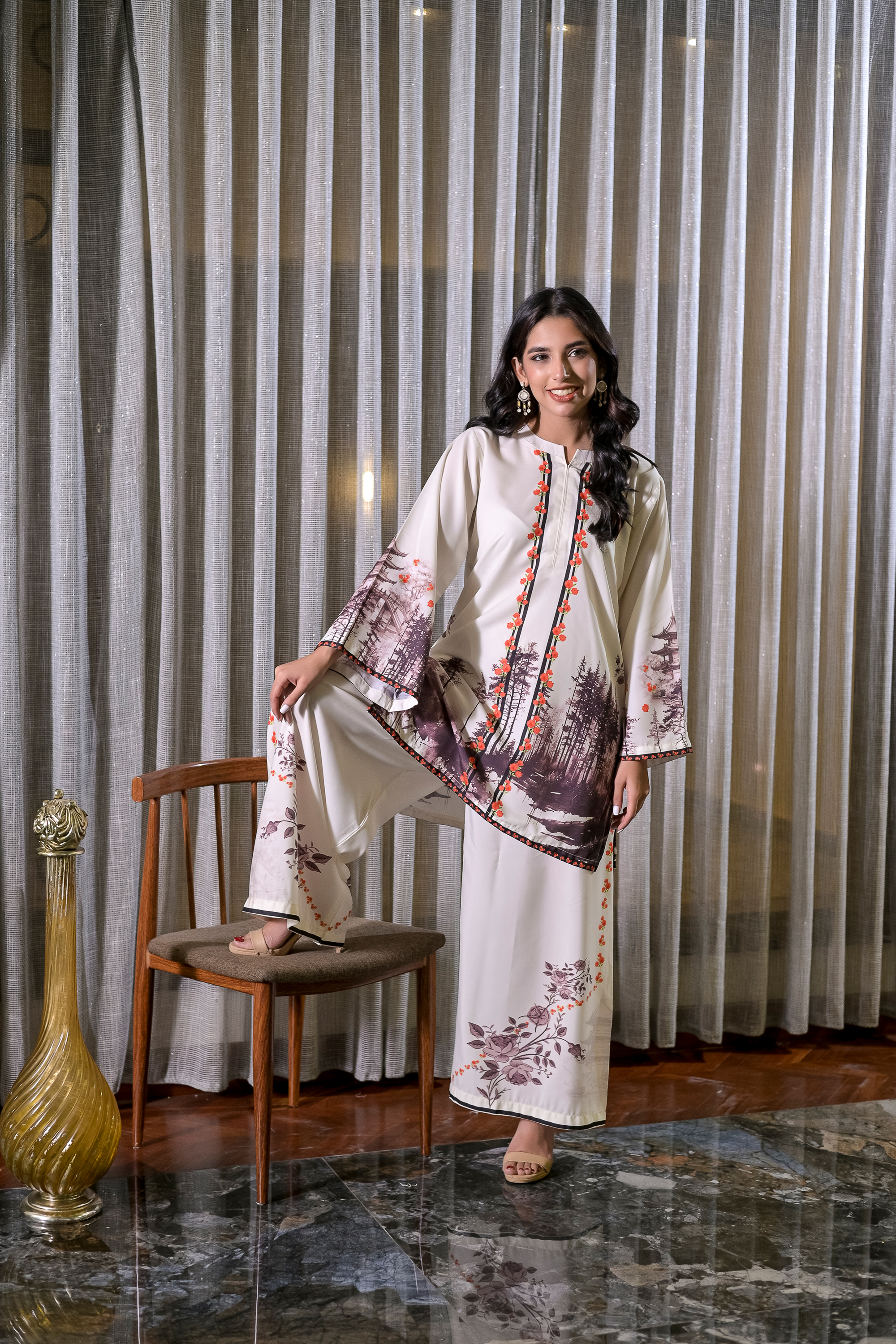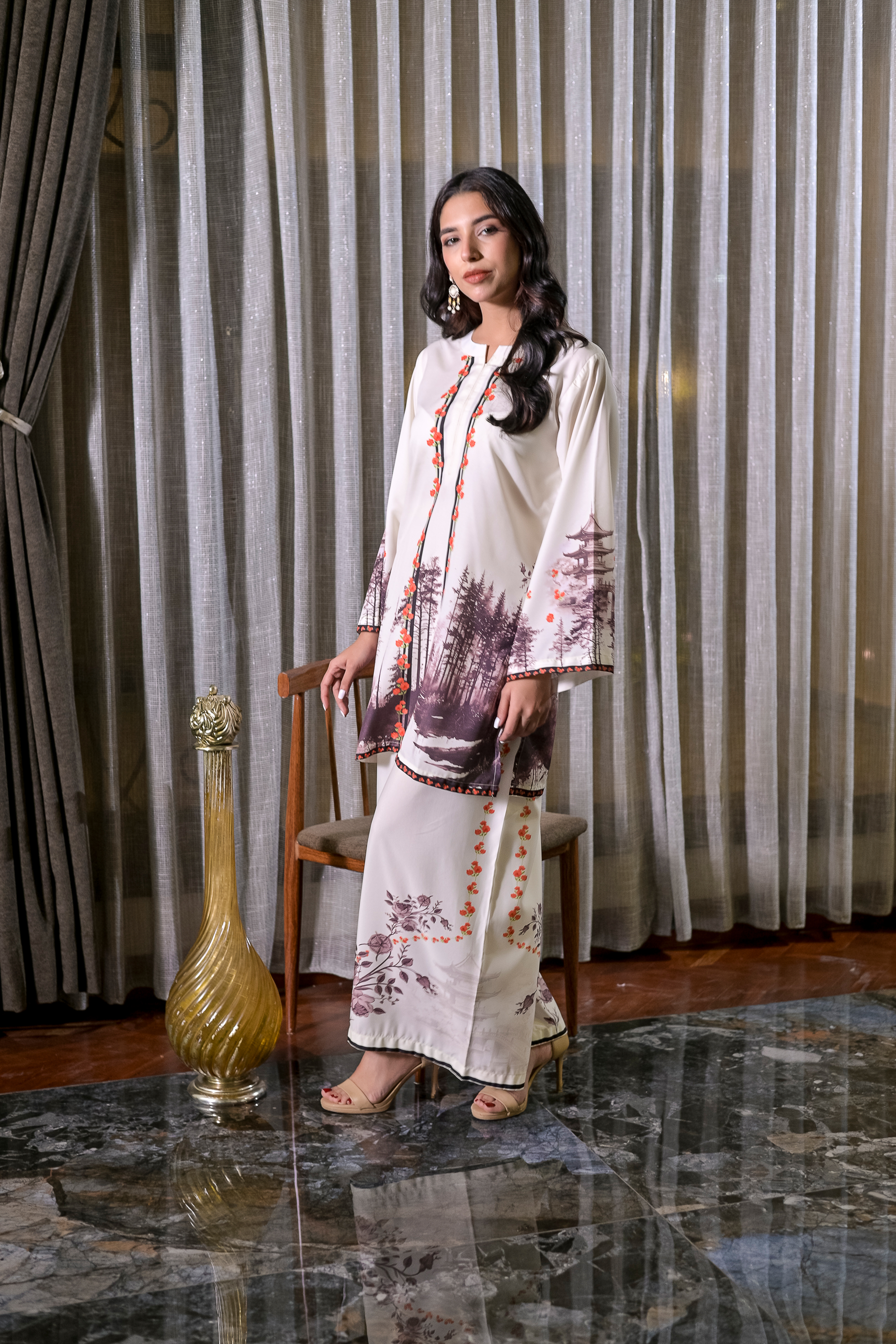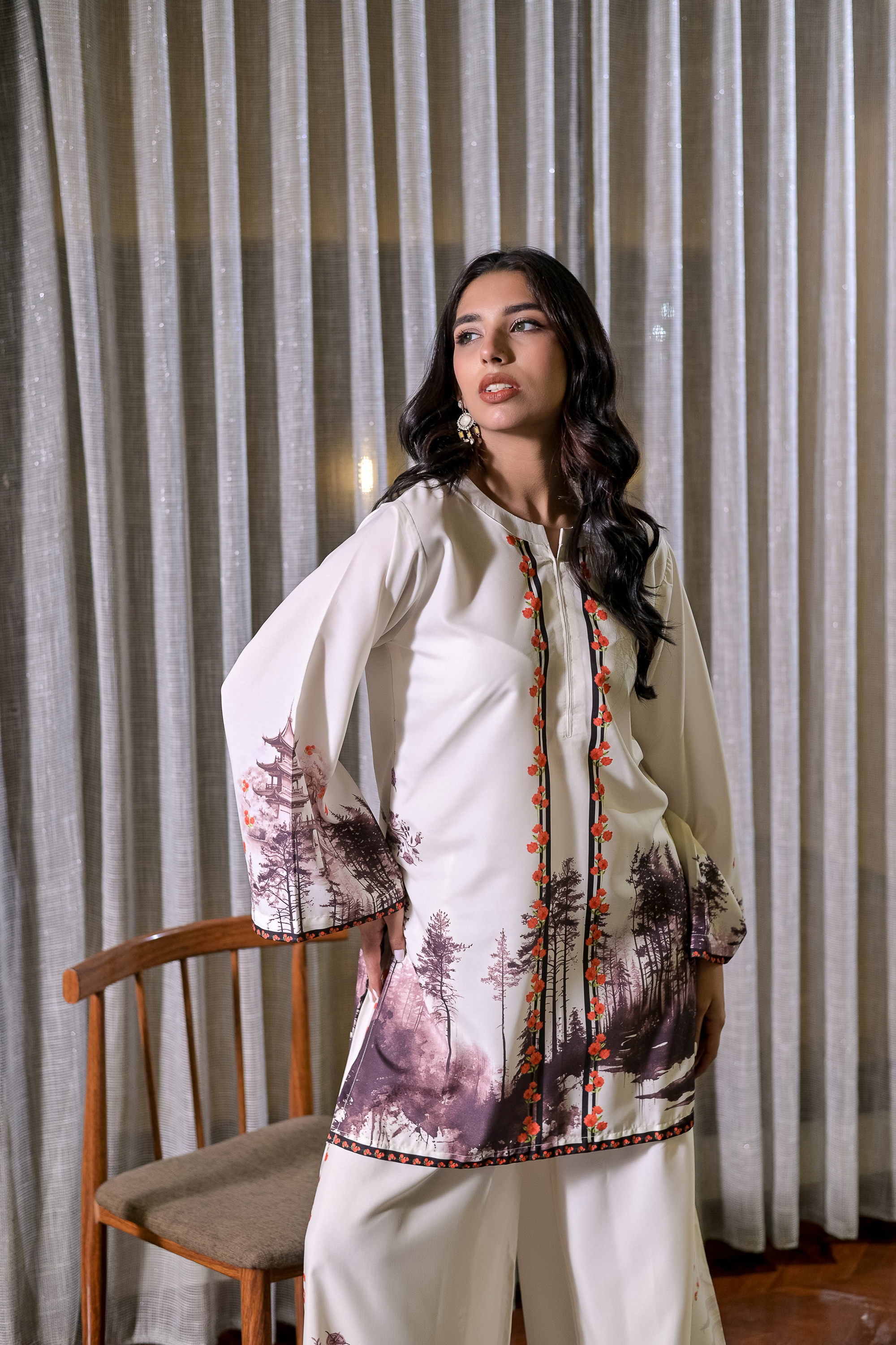 Amber Woods brings an artistic touch to everyday elegance with its ivory base adorned in earthy tree motifs and accented by warm amber details. Tailored from lightweight blended raw silk, this 2-piece stitched set features a straight-cut shirt with wide sleeves and coordinating trousers, both carrying subtle forest-inspired prints. Natural, graceful, and refreshing—ideal for a statement look that stays grounded in charm.