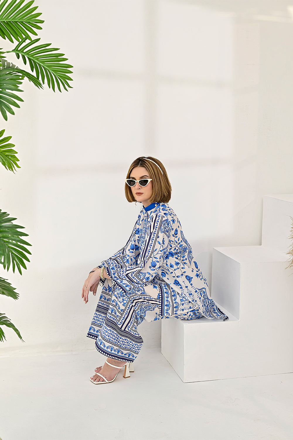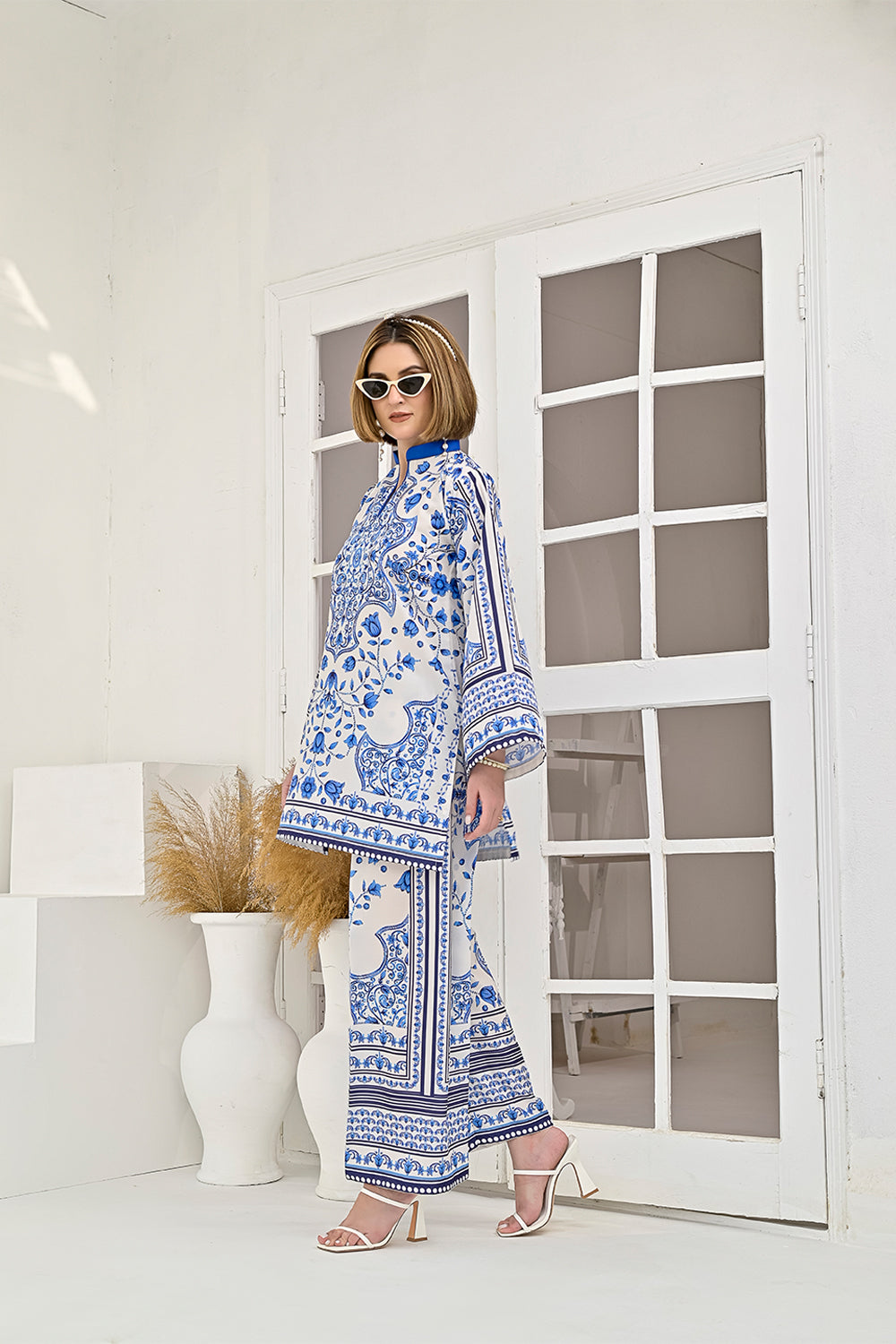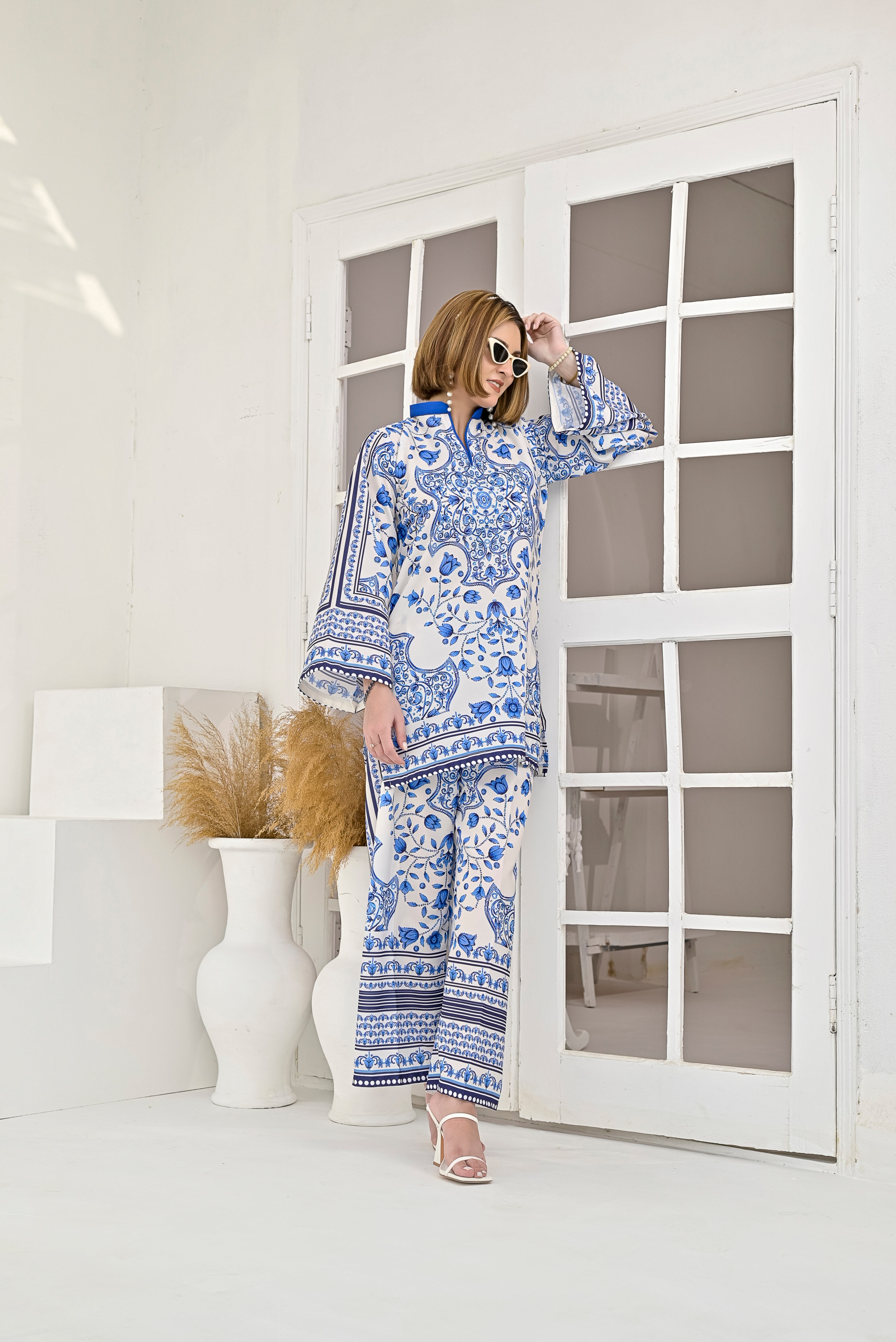 Azure Vine captures timeless charm with its fresh white base and intricate cobalt blue prints. Made from lightweight blended raw silk, this 2-piece stitched set includes a straight-cut shirt with a mandarin collar and wide sleeves, paired with printed trousers that echo the same elegant motifs. Breezy, crisp, and effortlessly polished—perfect for daywear that stands out without trying too hard.
