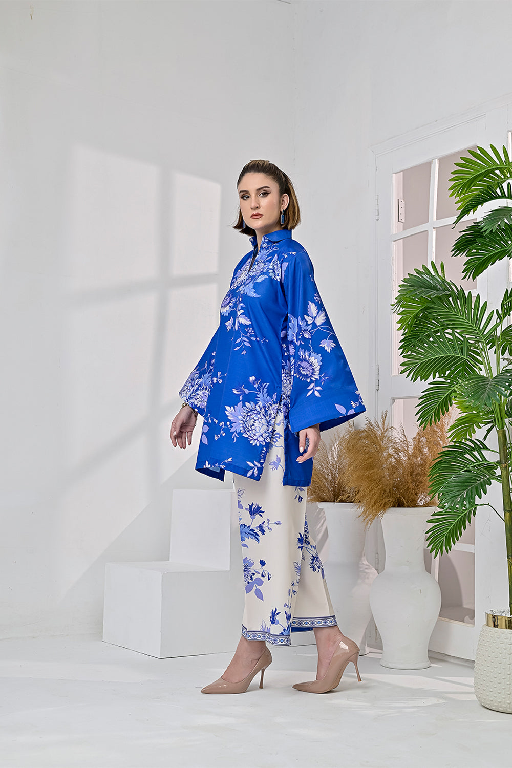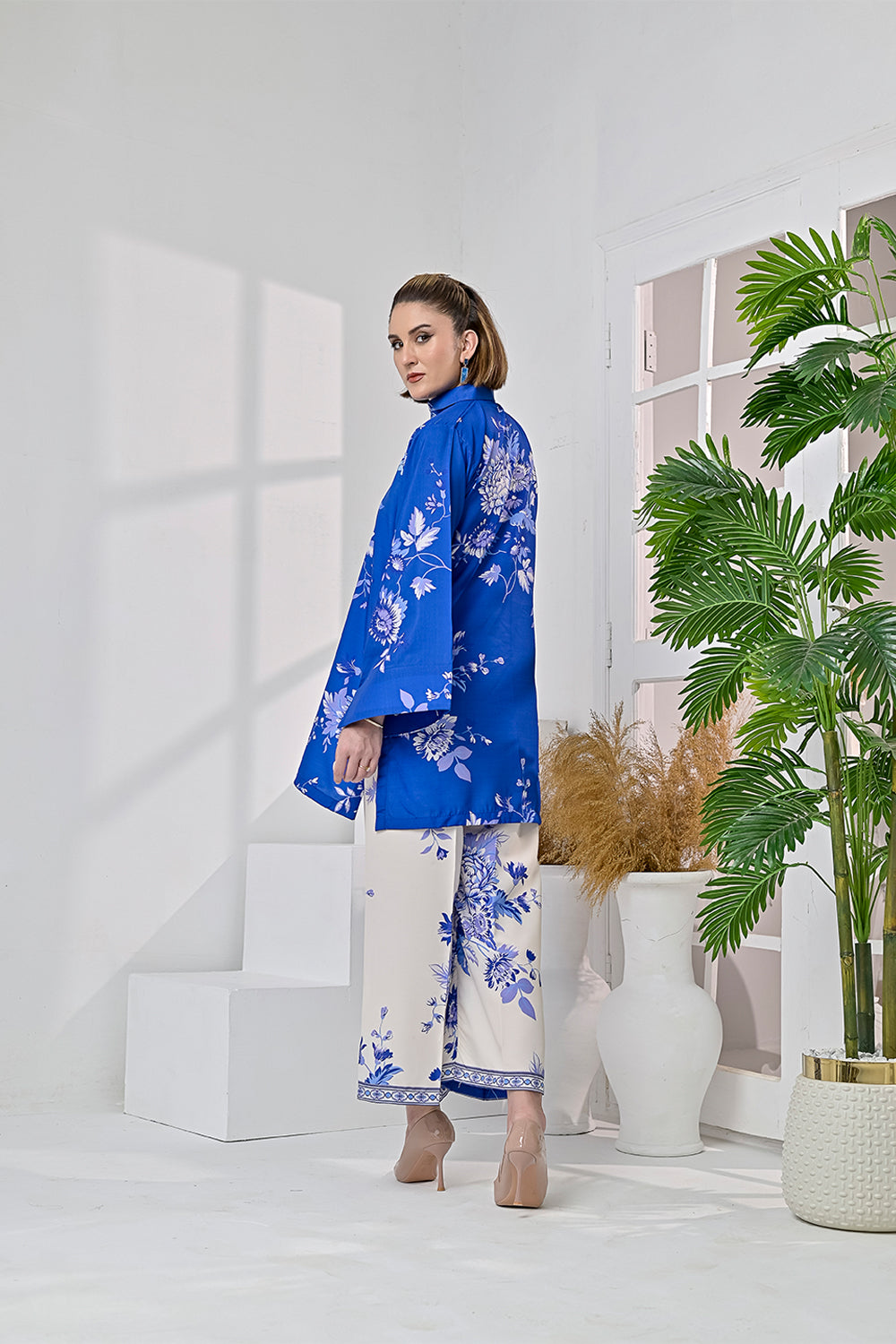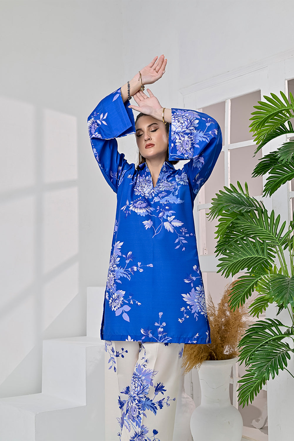 Blue Reverie is a fresh take on floral with a bold twist. The cobalt blue shirt is covered in delicate, white-toned floral blooms, creating a striking contrast against the soft ivory base of the matching pants. Light, breathable blended raw silk fabric keeps it effortless, while the calm, floral composition adds quiet charm. Whether you’re heading out or staying in, this 2 piece stitched set makes looking put-together feel completely natural.