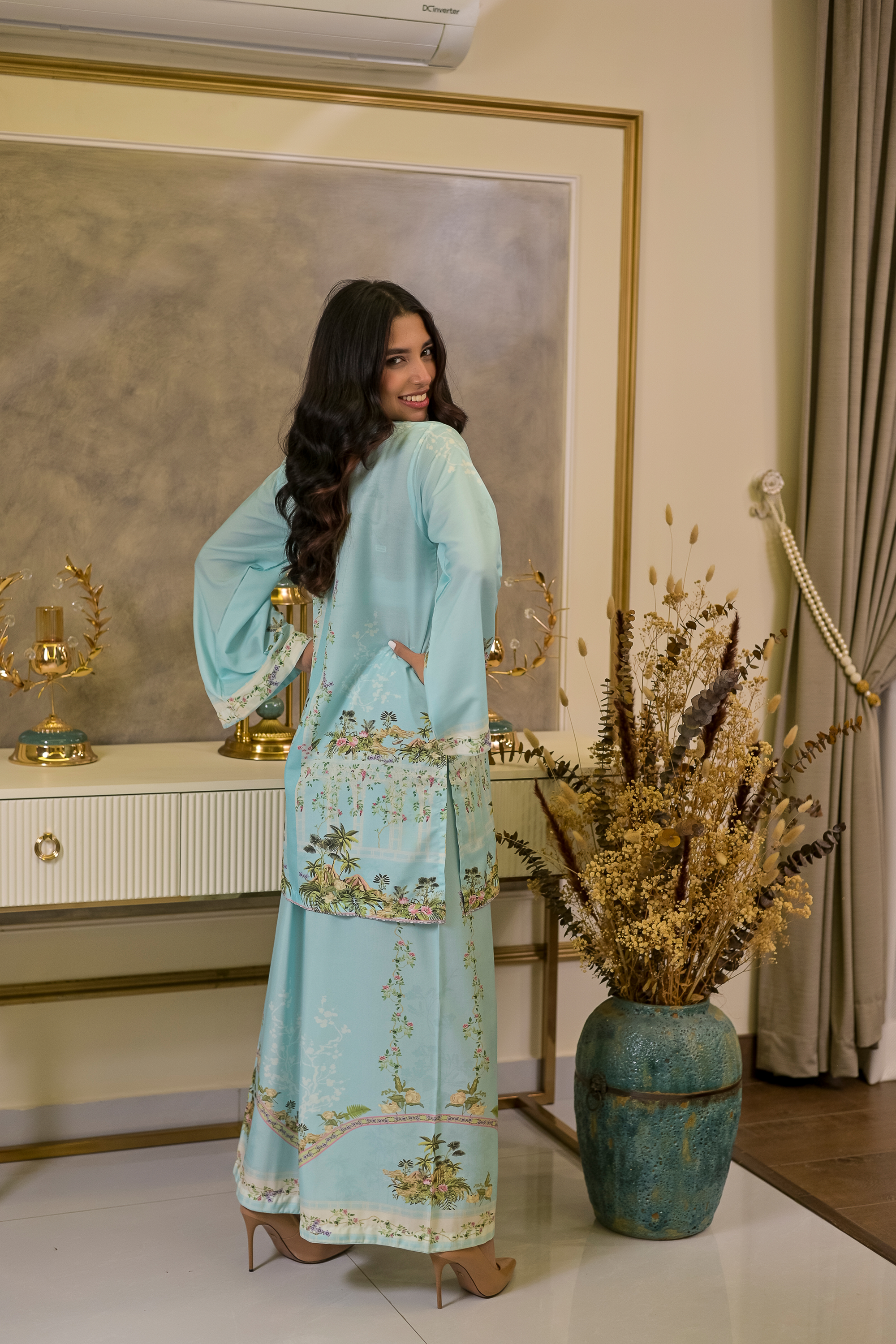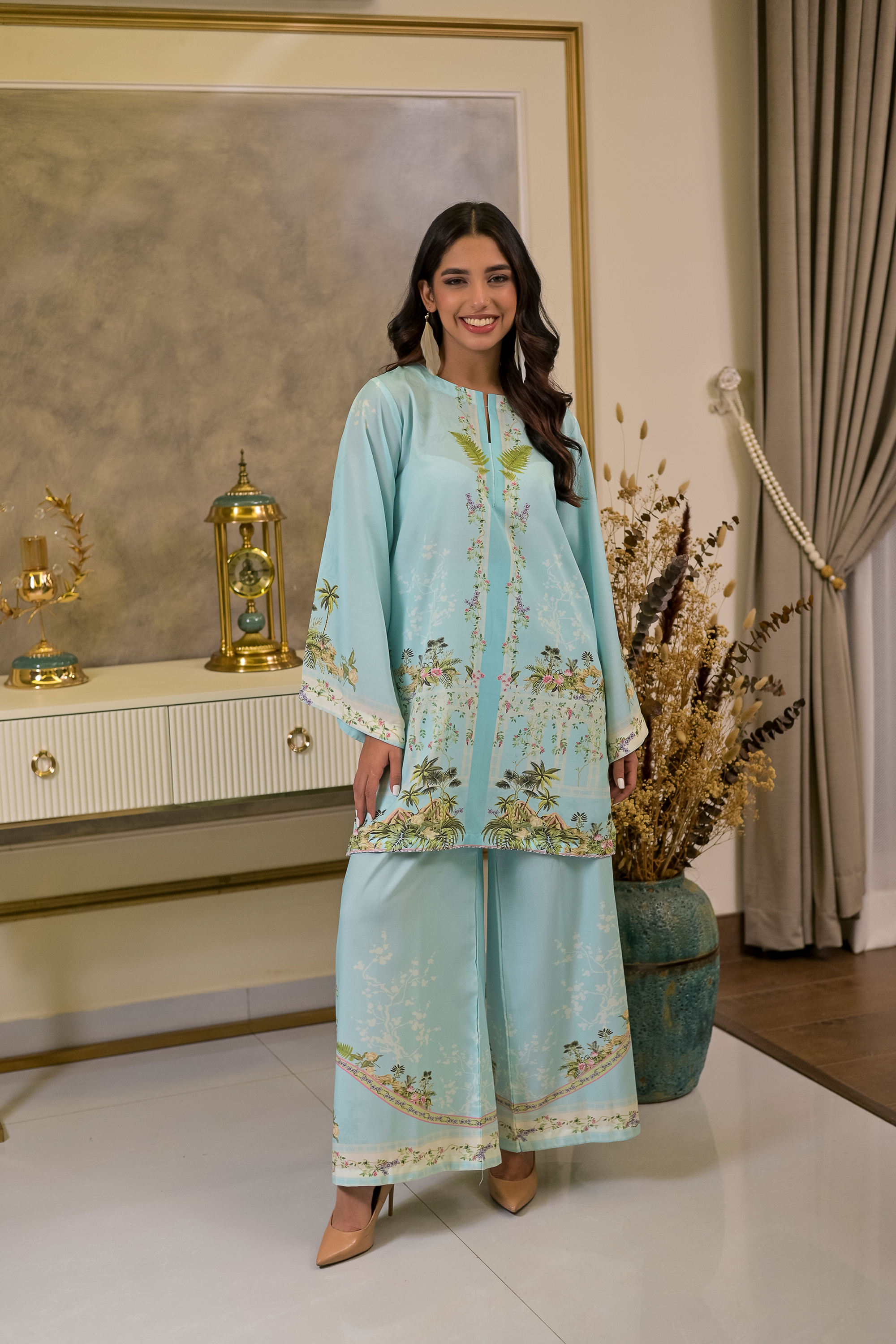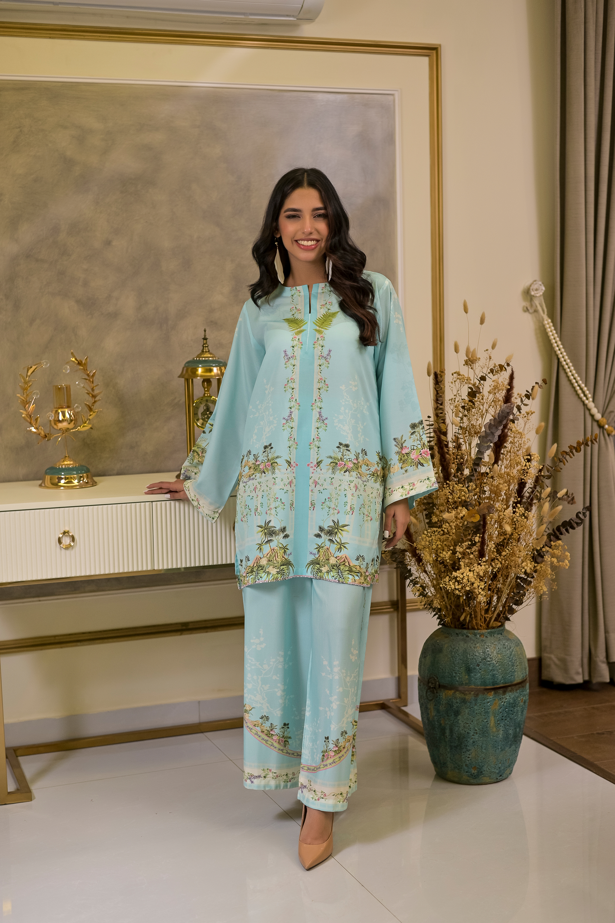 Blue Serenity embodies calm sophistication with its soft aqua-blue base accented by delicate, nature-inspired prints. Tailored from lightweight blended raw silk, this 2-piece stitched set features a straight-cut shirt with full sleeves and matching trousers, both highlighted with subtle detailing along the borders. Fresh, graceful, and uplifting—perfect for daytime wear that feels as serene as it looks.