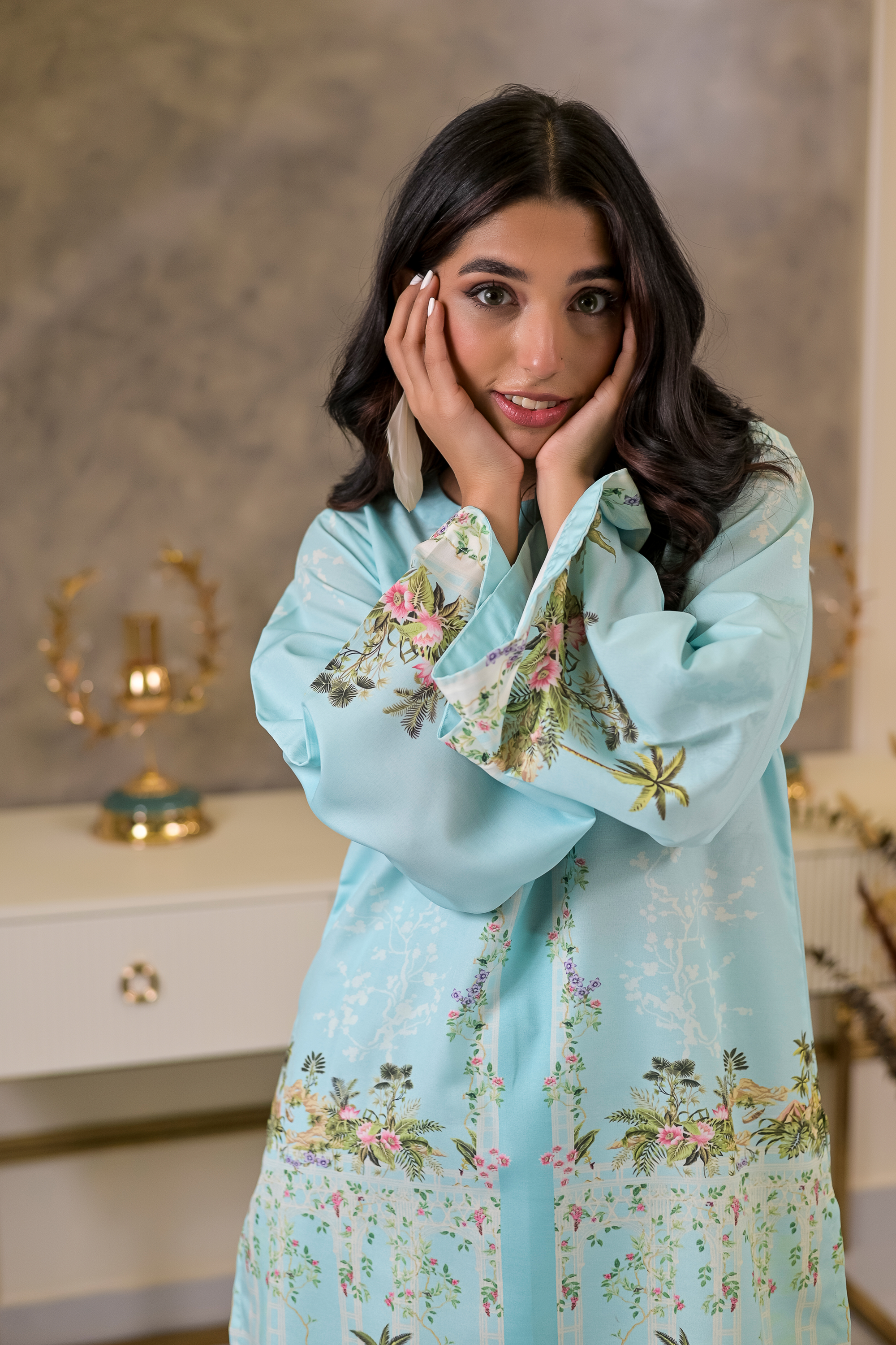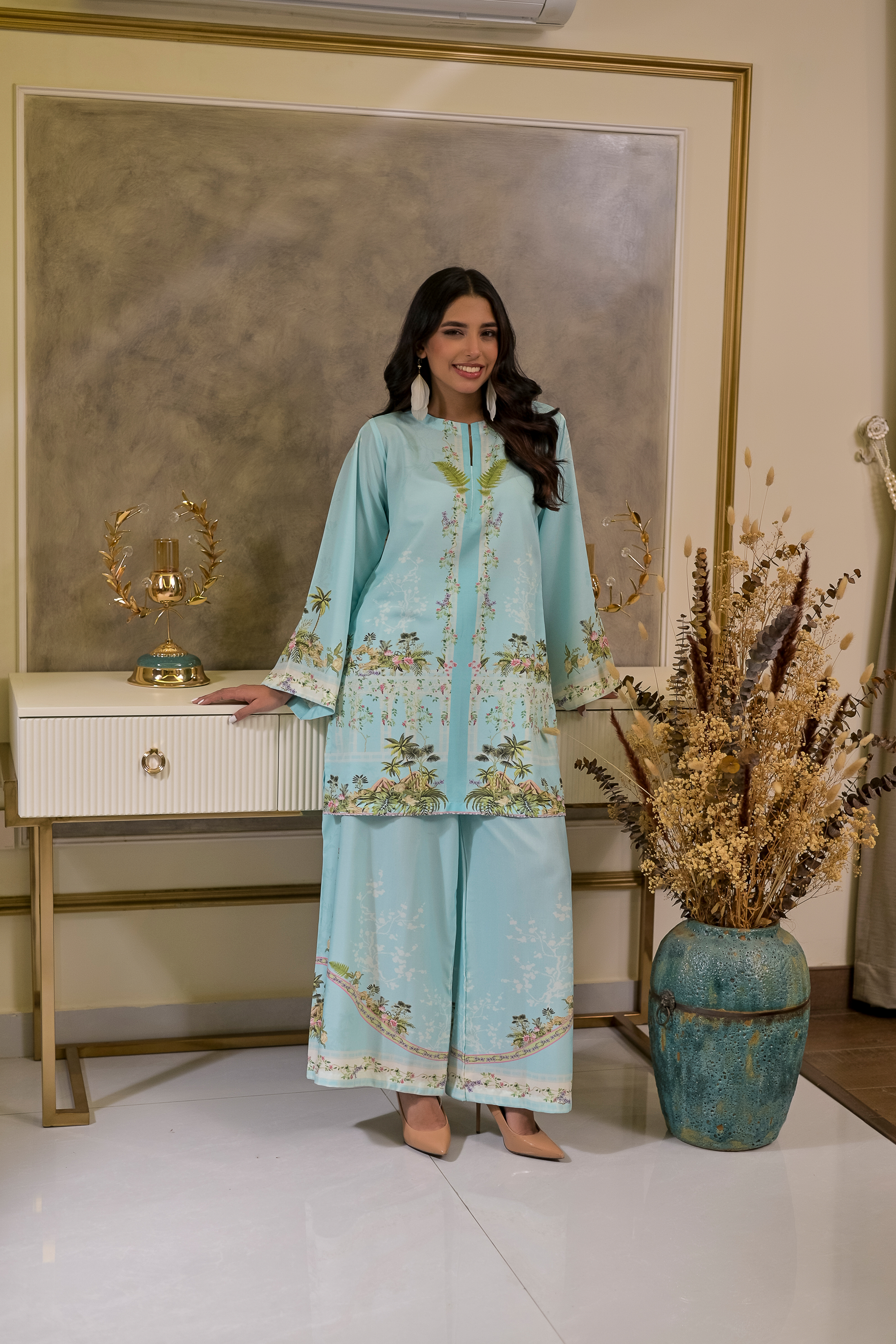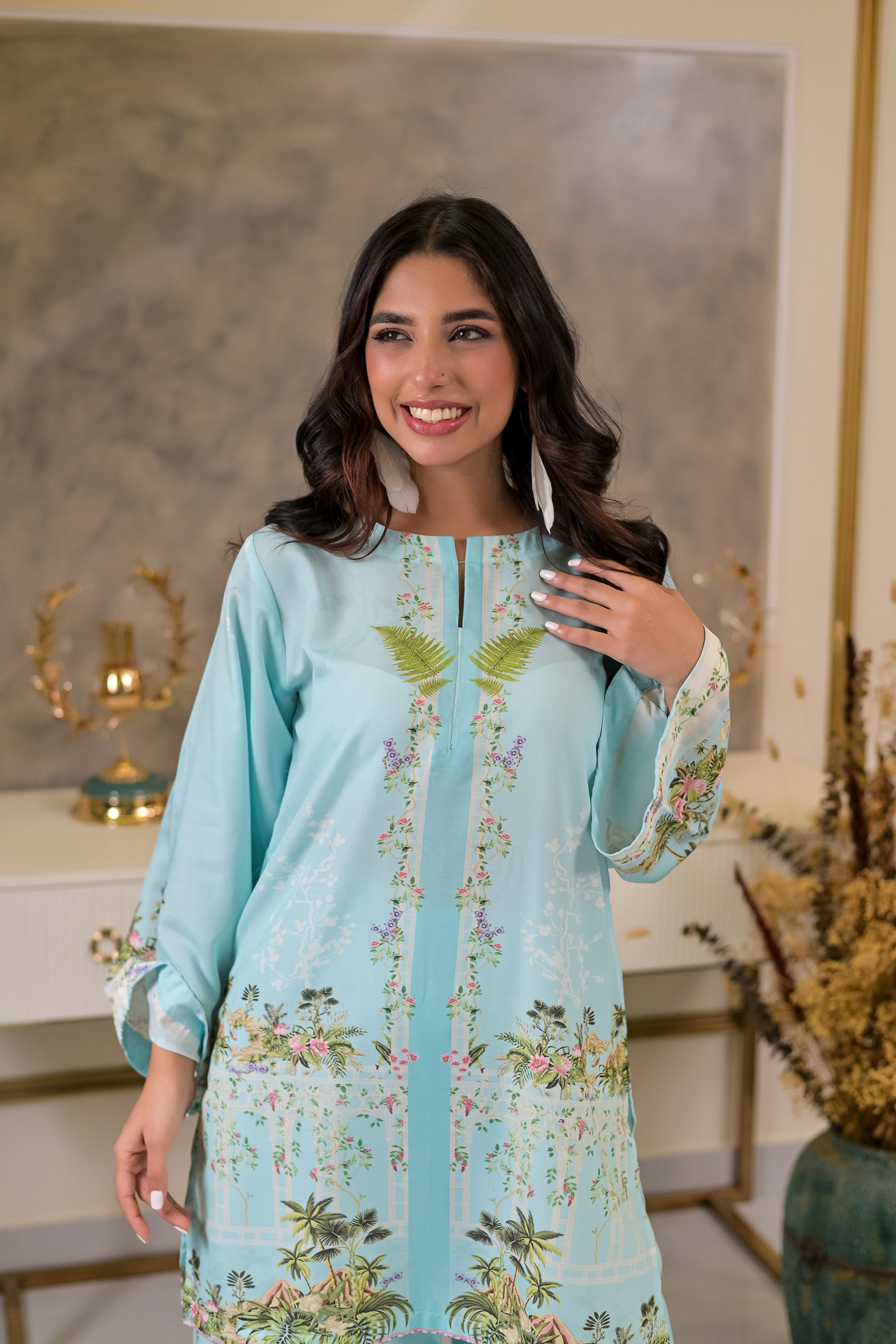 Blue Serenity embodies calm sophistication with its soft aqua-blue base accented by delicate, nature-inspired prints. Tailored from lightweight blended raw silk, this 2-piece stitched set features a straight-cut shirt with full sleeves and matching trousers, both highlighted with subtle detailing along the borders. Fresh, graceful, and uplifting—perfect for daytime wear that feels as serene as it looks.