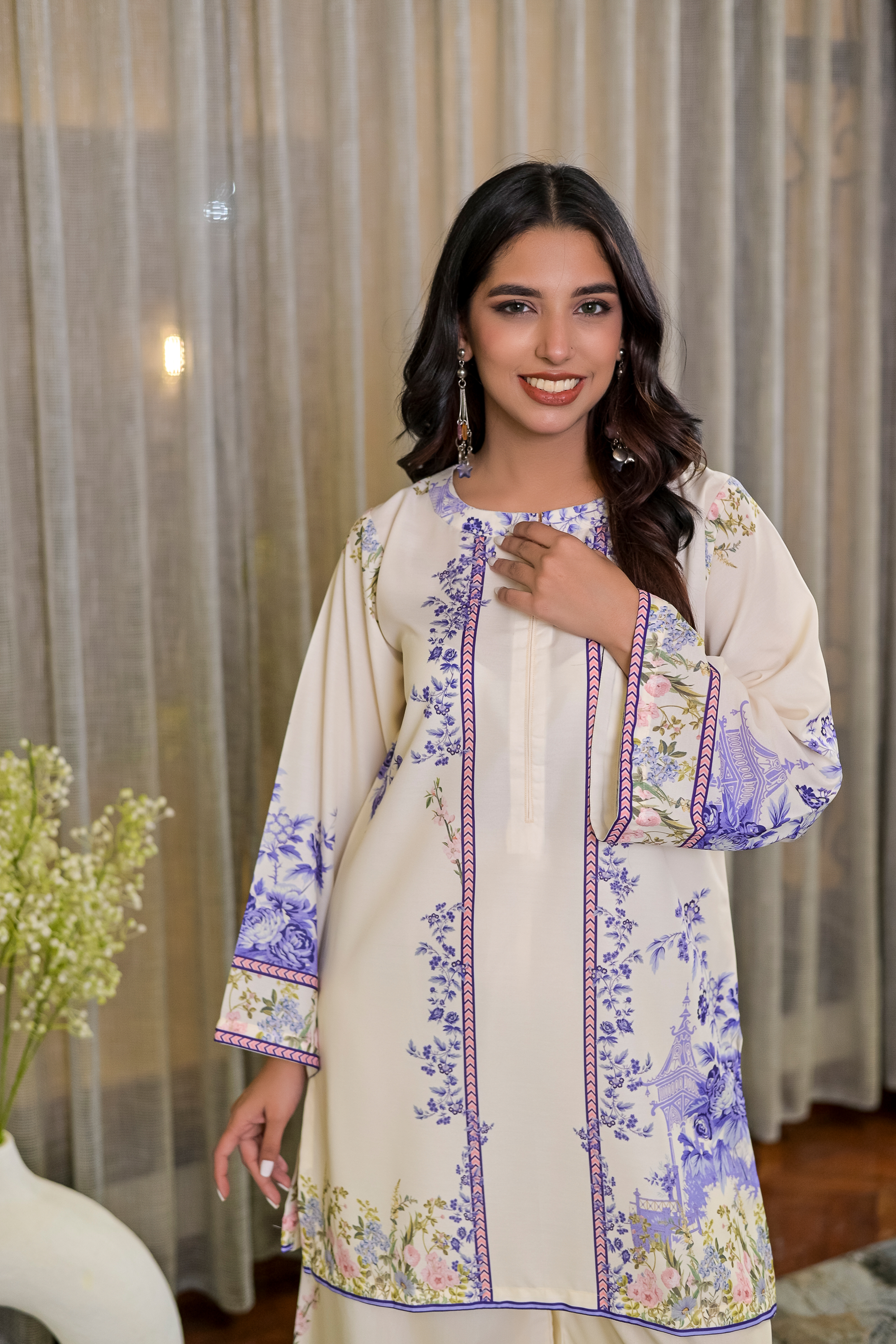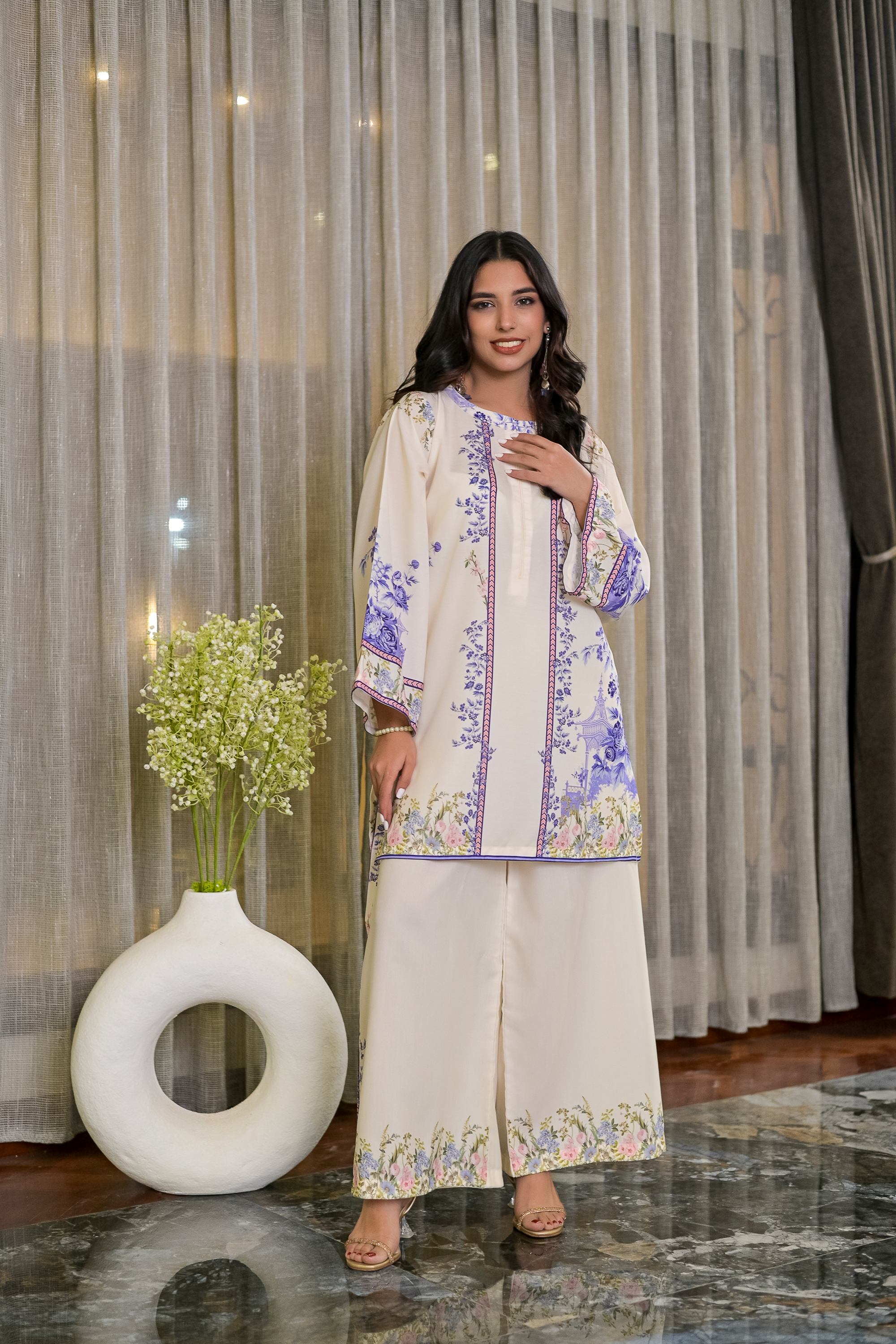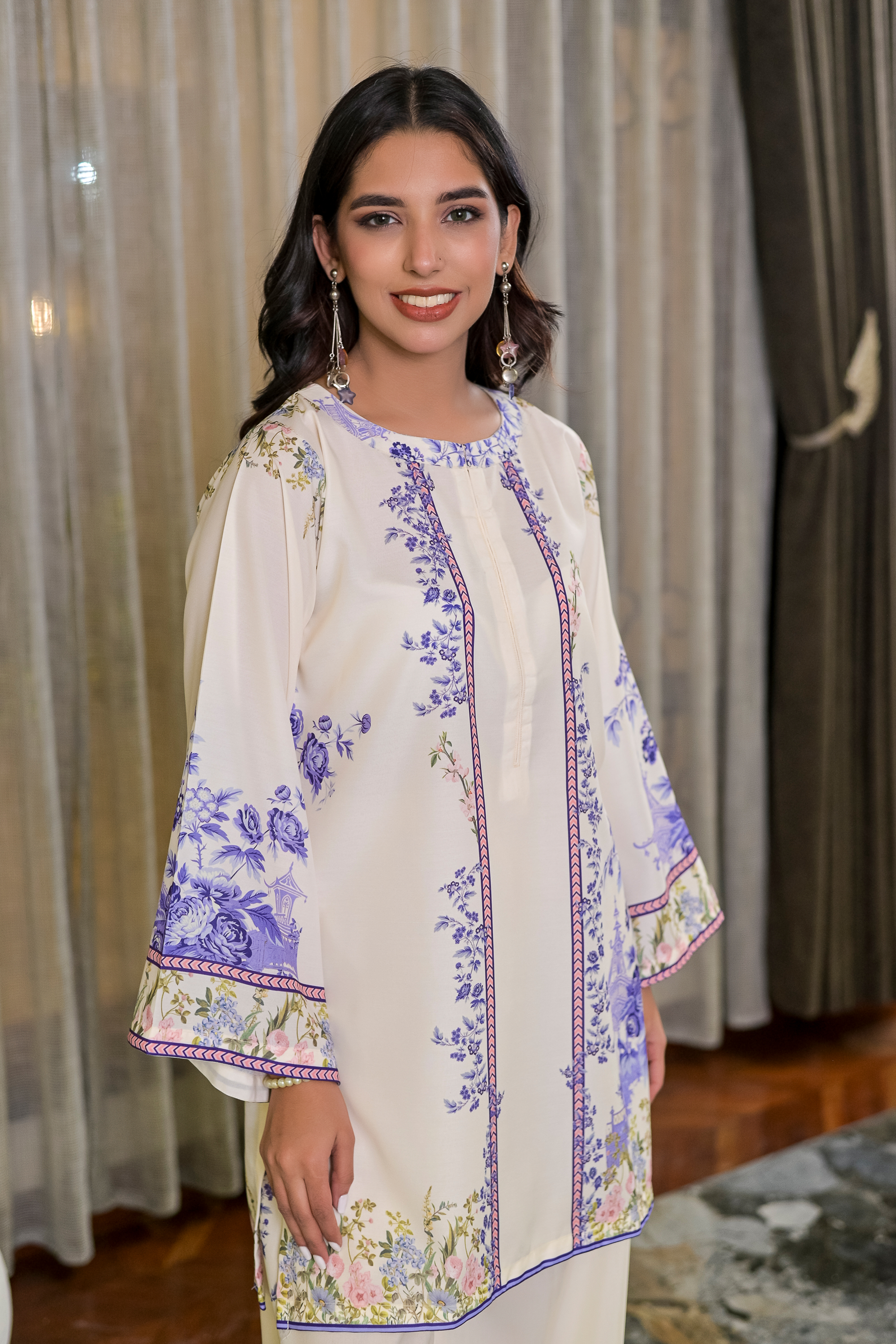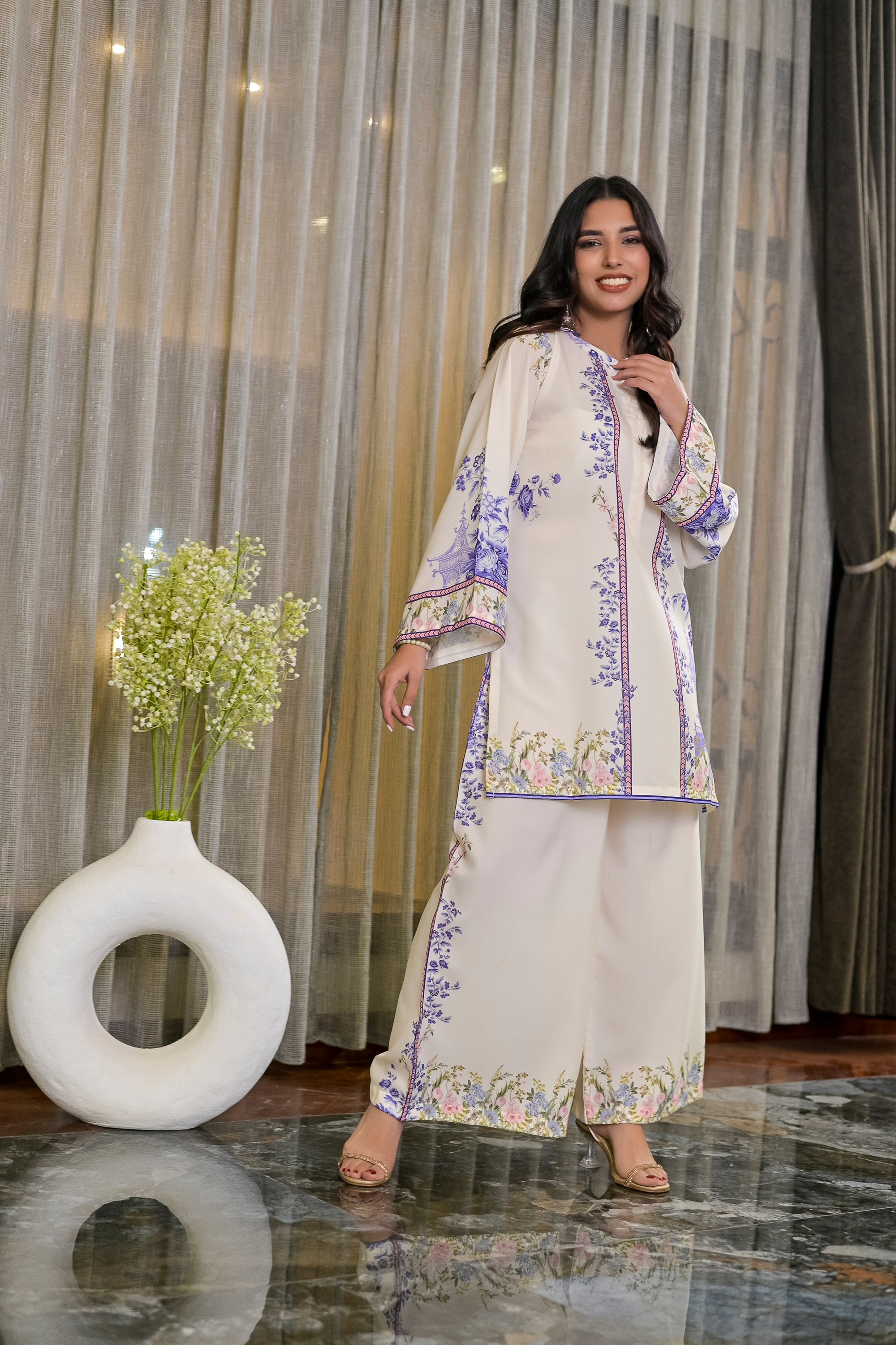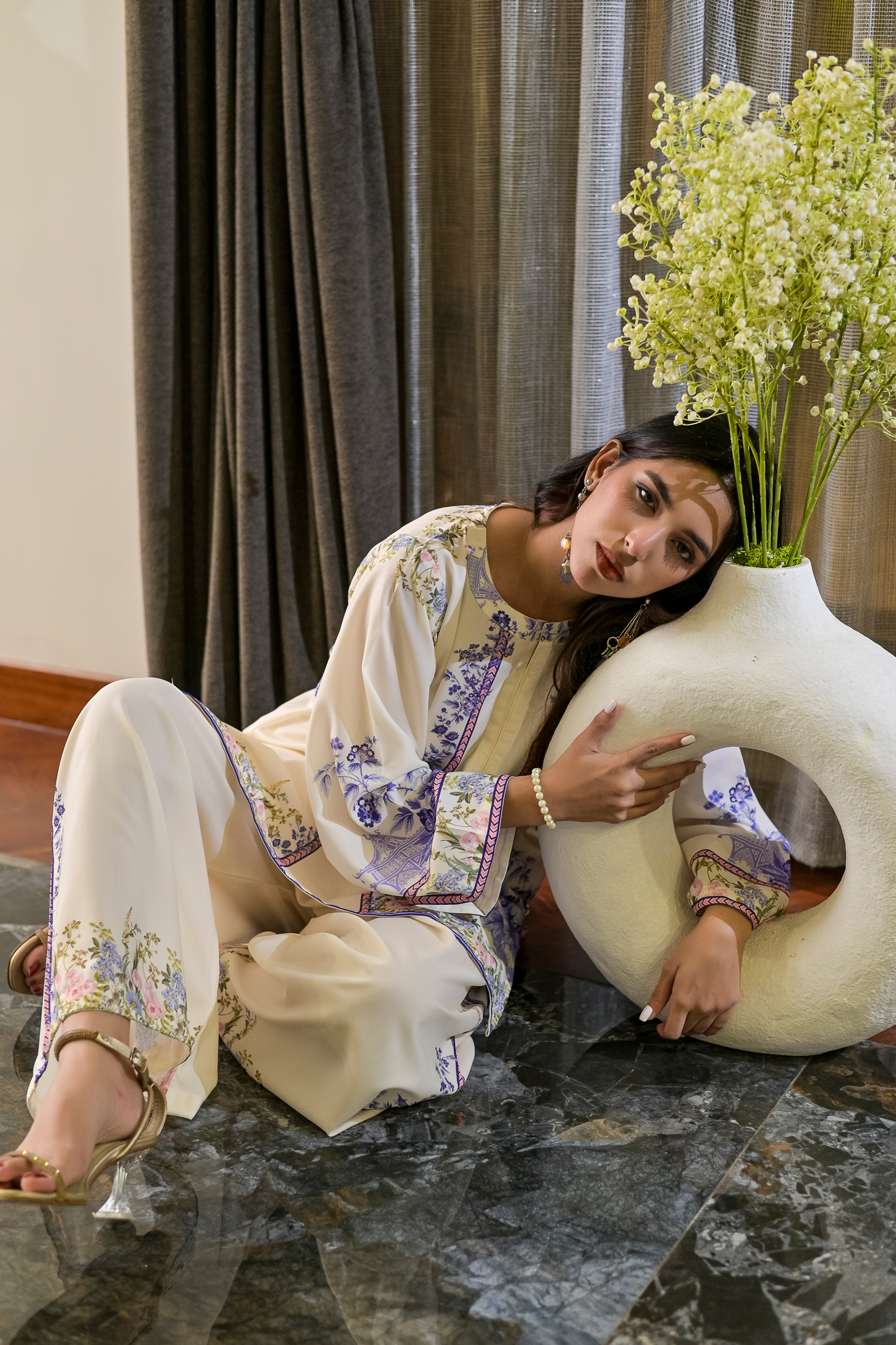 Ivory Dream captures timeless elegance with its soft ivory base adorned with delicate lavender and pastel accents. Crafted from lightweight blended raw silk, this 2-piece stitched set features a straight-cut shirt with wide sleeves and coordinating trousers, both detailed with subtle floral borders. Graceful, airy, and refined—perfect for elevating your everyday style with understated charm.