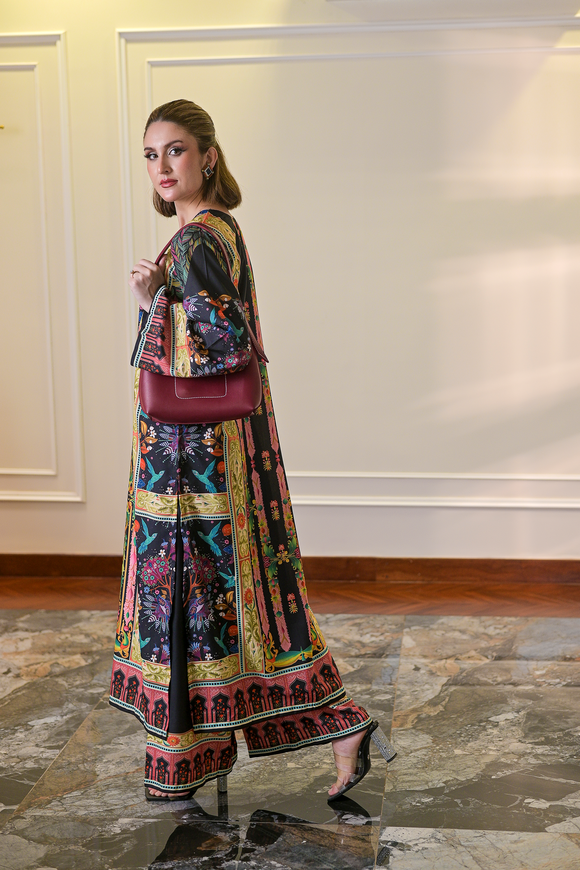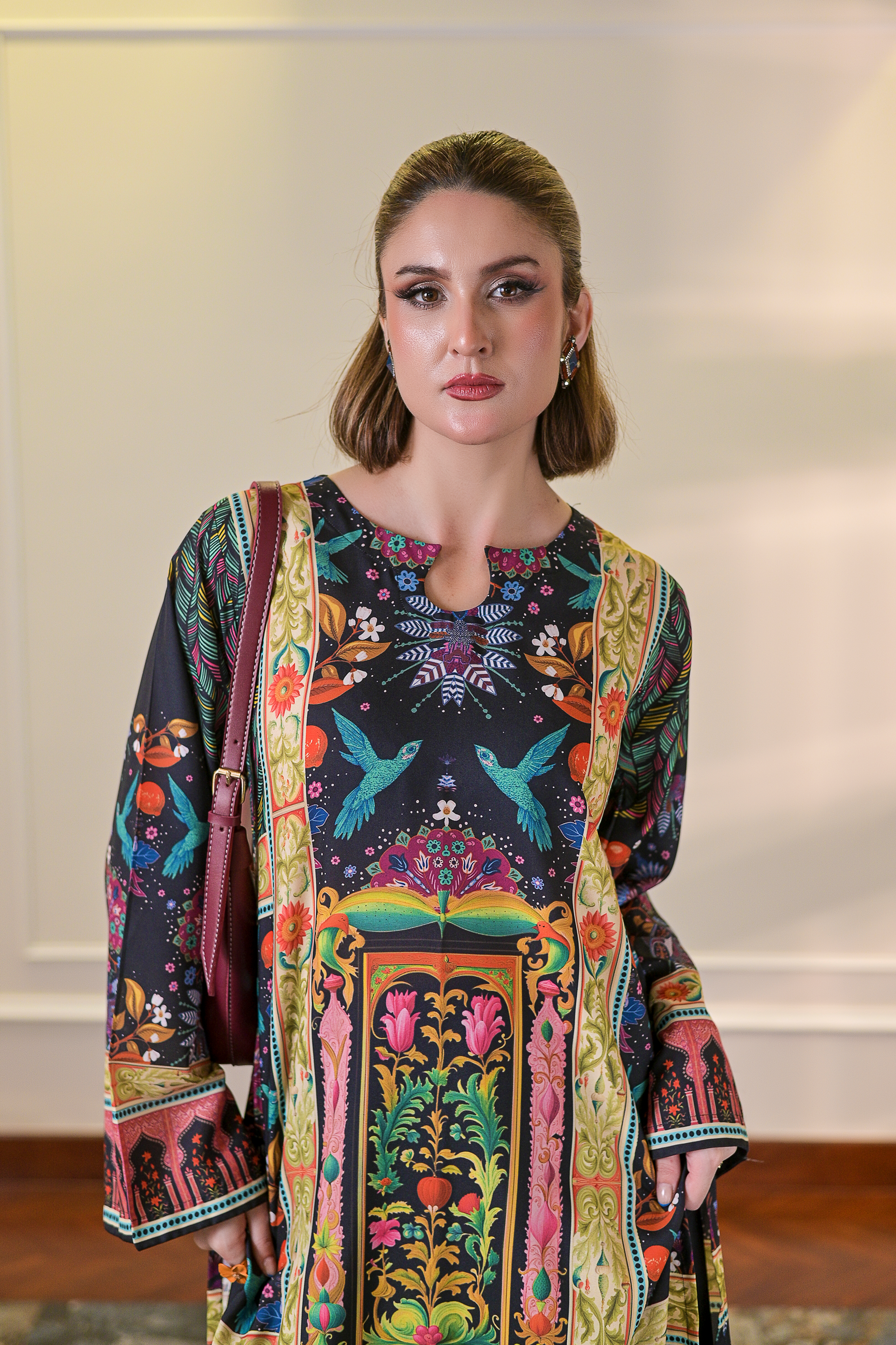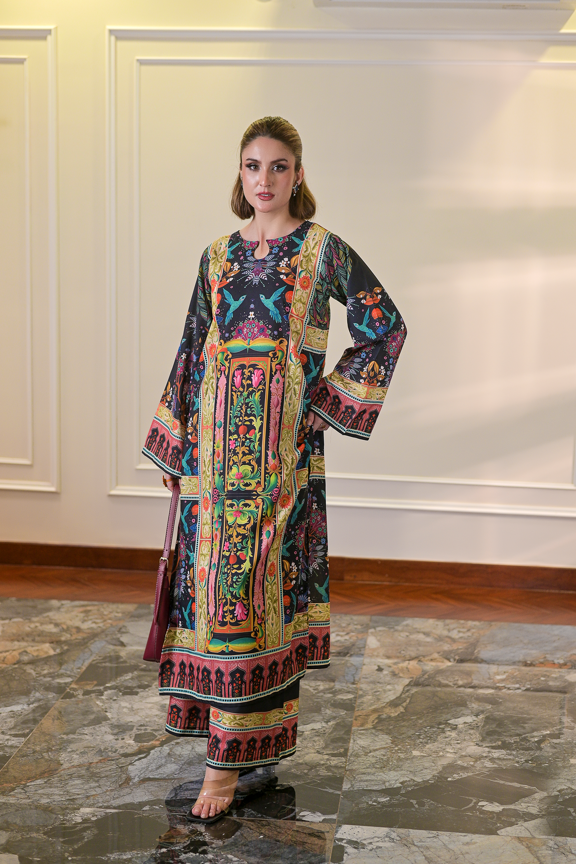 Luxe makes a bold statement with its deep black base, elevated by vibrant motifs and ornate patterns in jewel tones. Crafted from soft blended raw silk, this 2-piece stitched set features a straight-cut shirt with full sleeves and matching trousers, echoing the same opulent detailing. Striking, elegant, and full of character—perfect for evenings when you want to stand out with effortless sophistication.