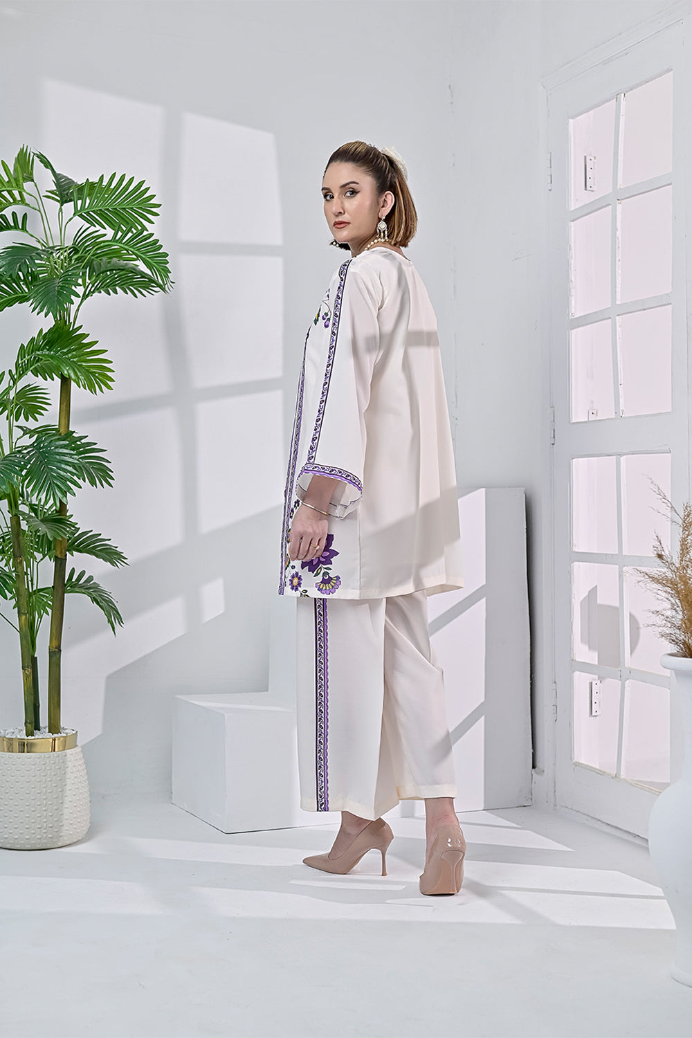 Orchid Border is clean, classic, and touched with bold floral energy. The ivory base is elevated by rich purple printed panels and floral accents in shades of yellow, green, and plum. Border detailing along the shirt and pants adds structure, while the wide sleeves and relaxed fit keep it easy and breathable. Made from soft blended raw silk, this 2 piece stitched suit balances simplicity with standout print placement—ideal for both casual elegance and everyday wear.