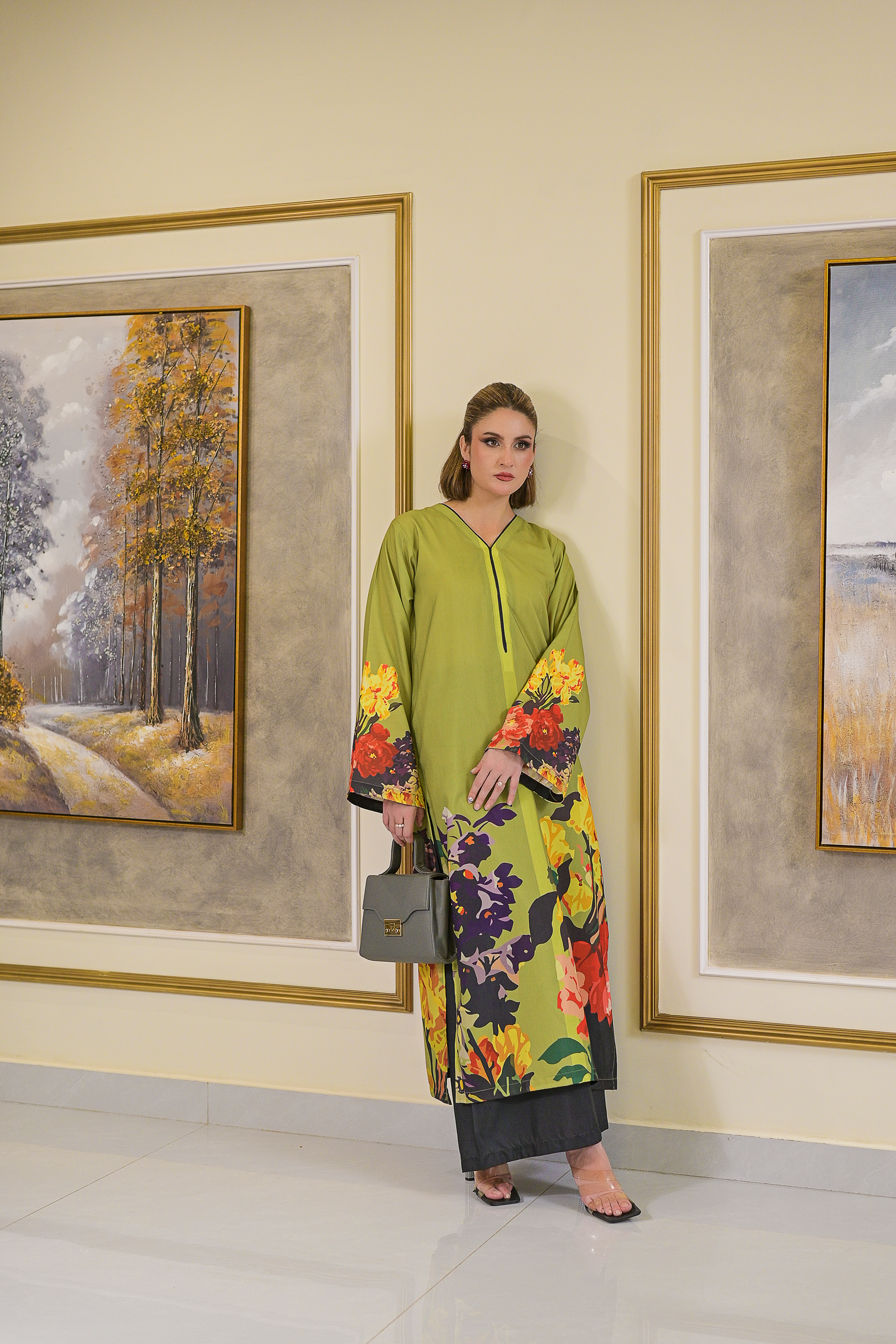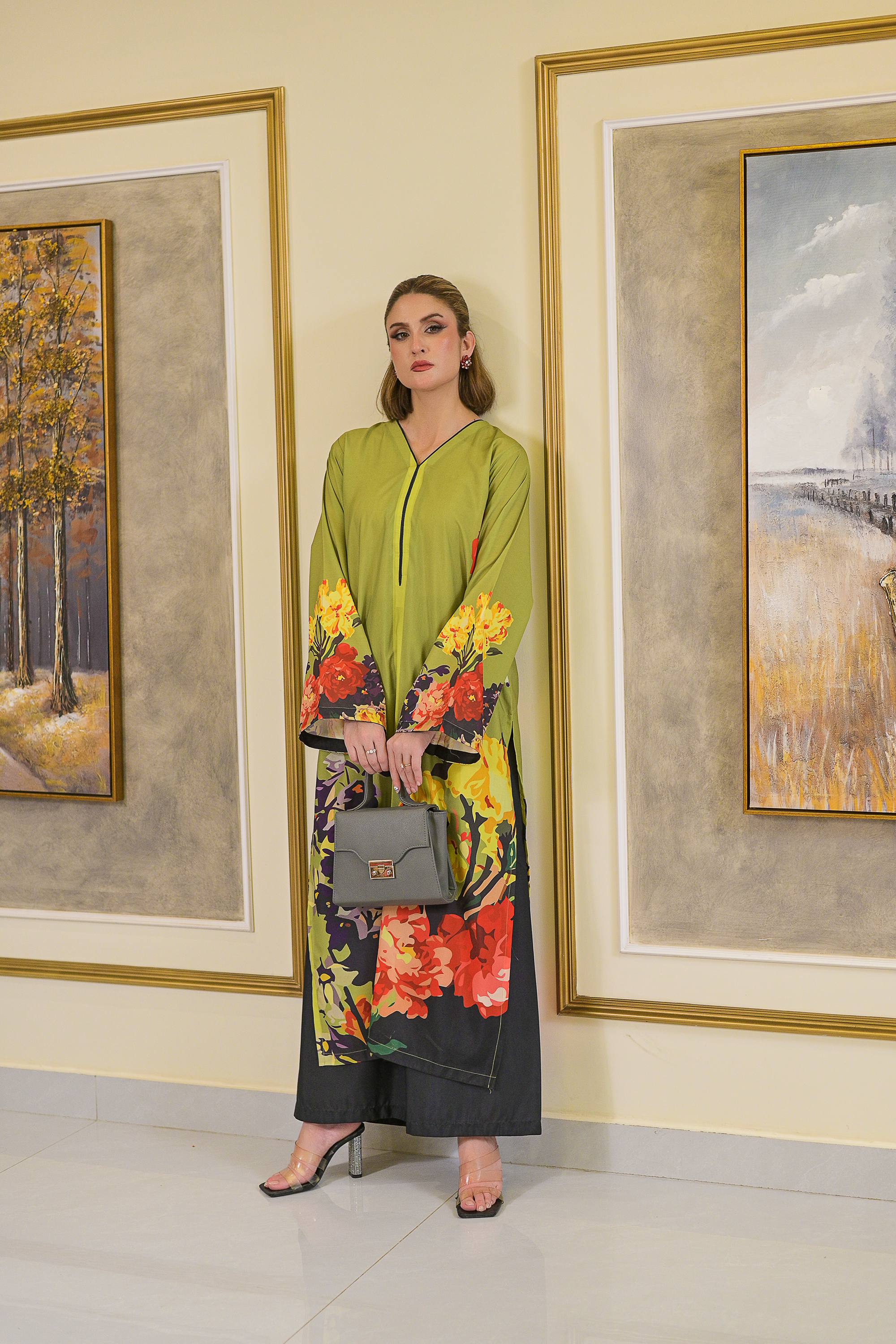 Sage blends earthy elegance with vibrant charm, featuring an olive-green base adorned with bold floral prints in rich sunset hues. Tailored from lightweight blended raw silk, this 2-piece stitched set includes a straight-cut shirt with full sleeves and dark-toned trousers for a balanced finish. Fresh, modern, and effortlessly chic—ideal for making a graceful statement in everyday wear.