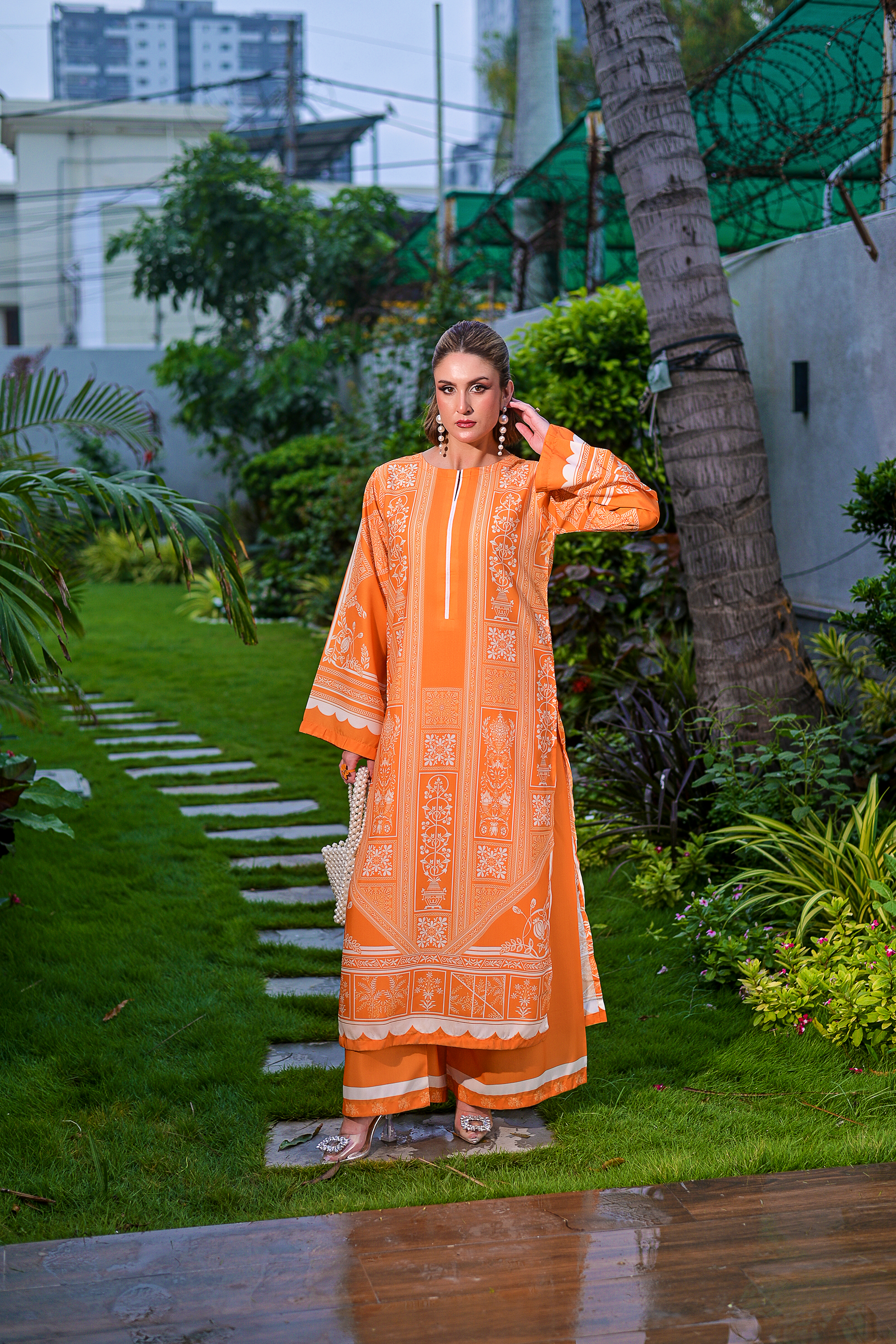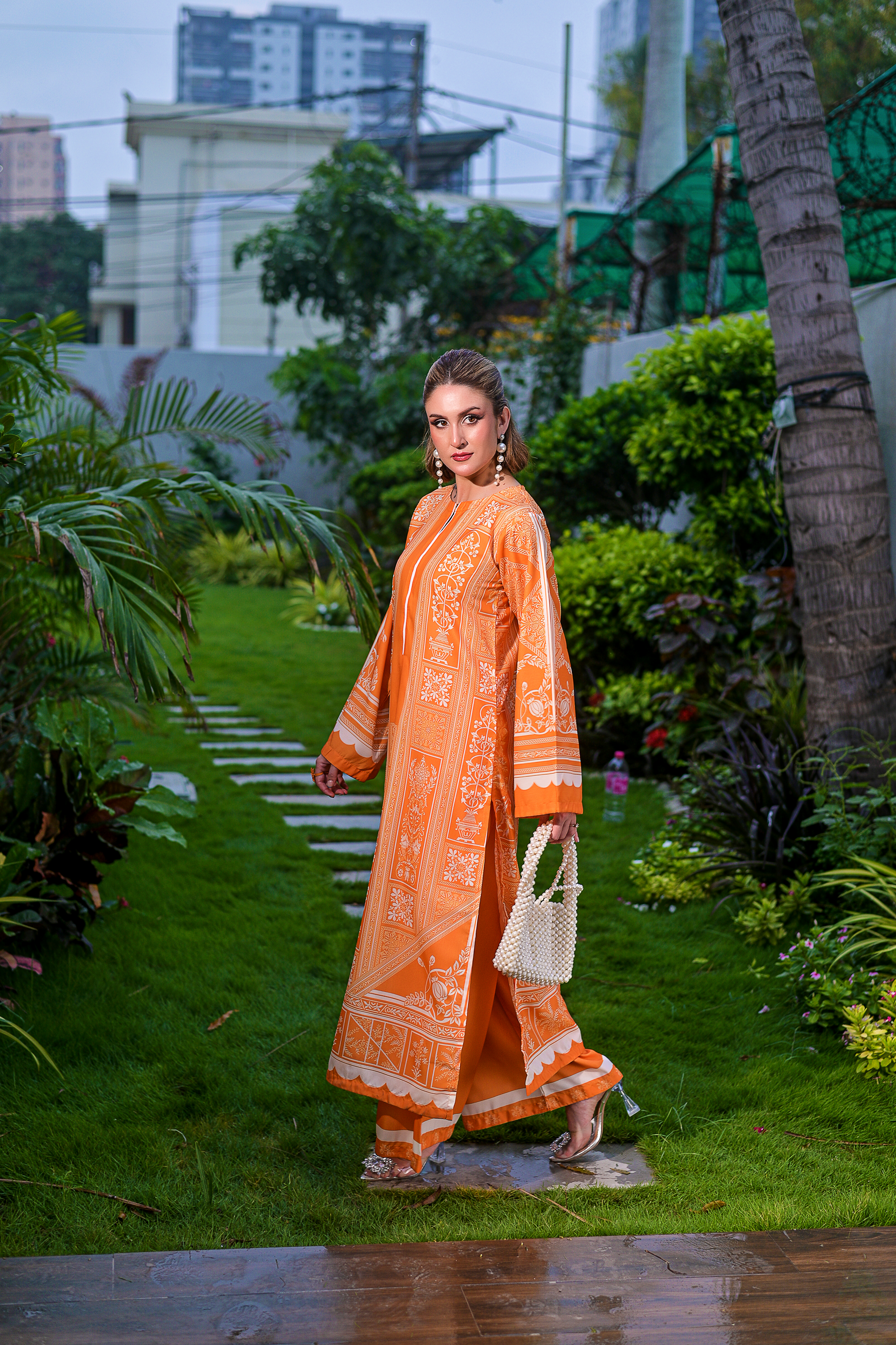 Tangerine radiates bold elegance with its vibrant orange base, uplifted by intricate white patterns that add striking contrast. Crafted from lightweight blended raw silk, this 2-piece stitched set includes a straight-cut shirt with full sleeves and matching trousers, offering both comfort and style. Bright, festive, and full of energy—perfect for daytime wear that makes a statement.