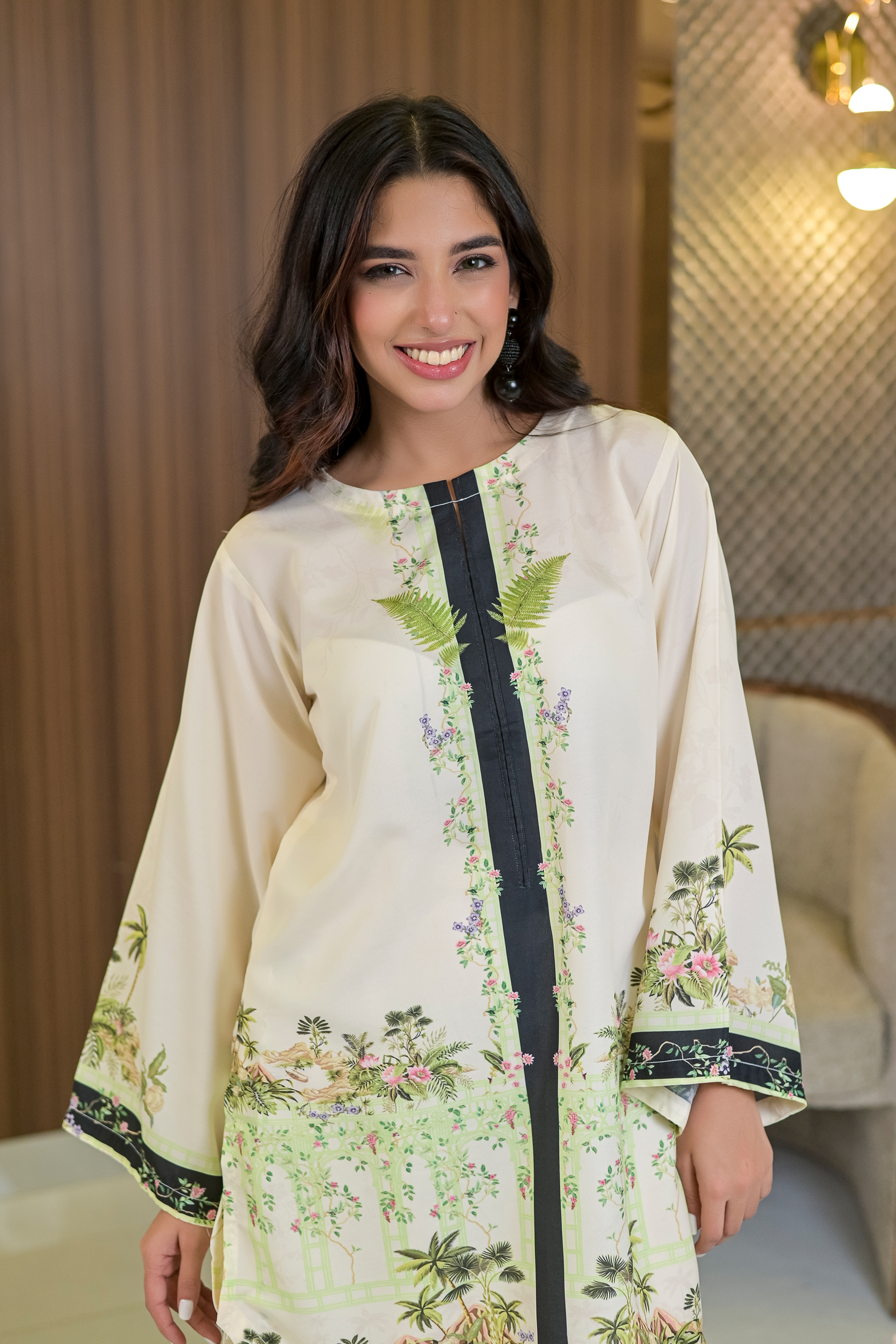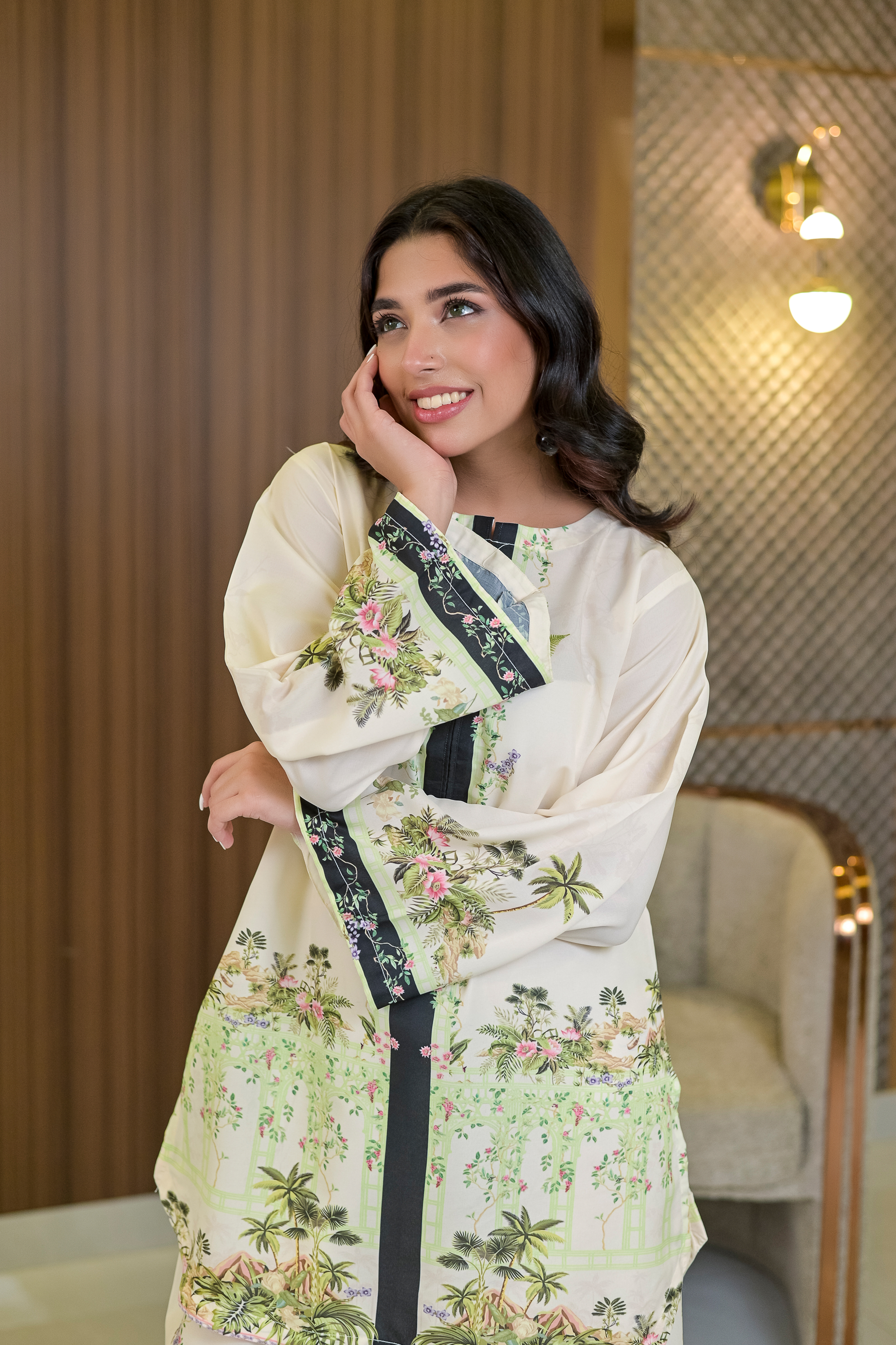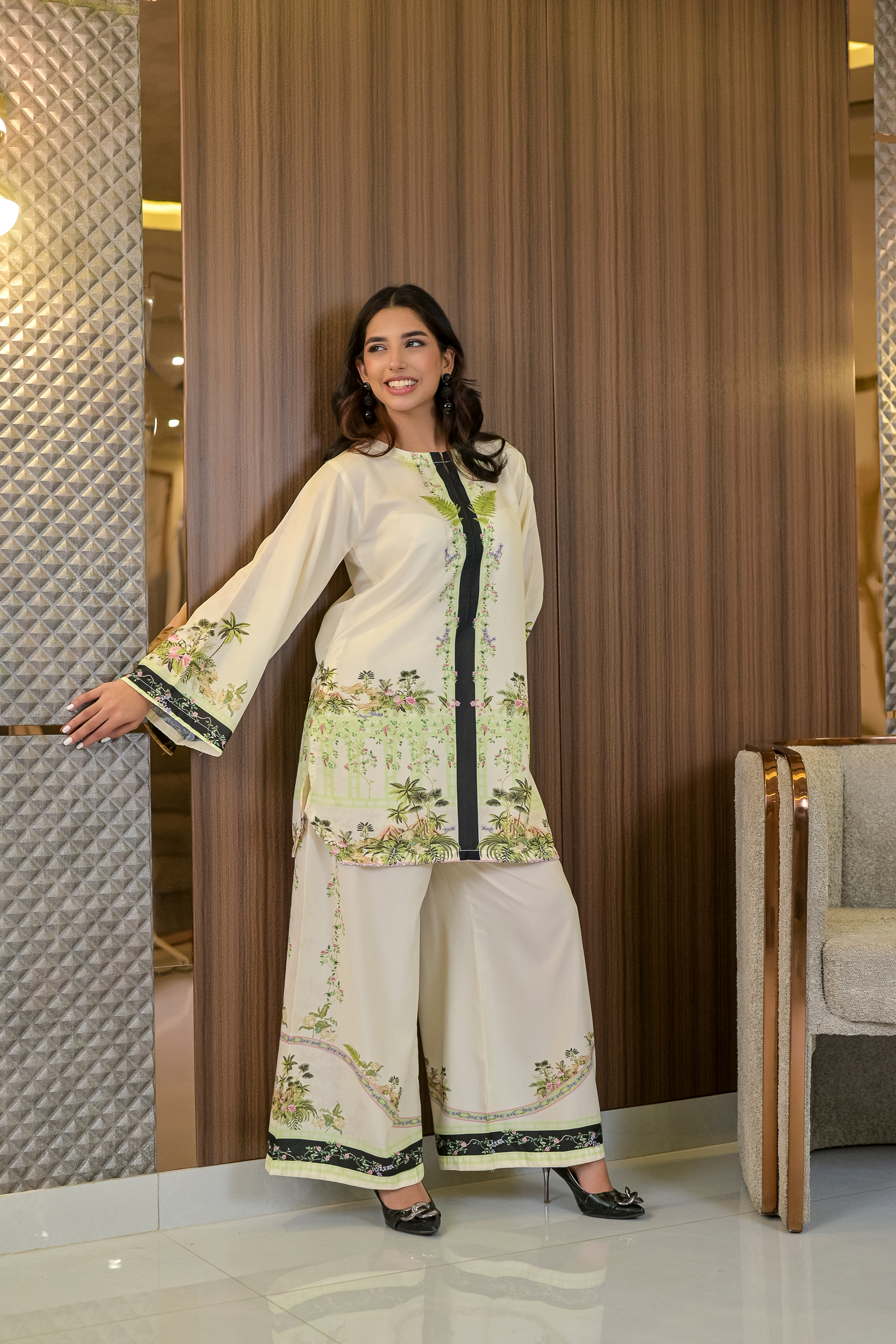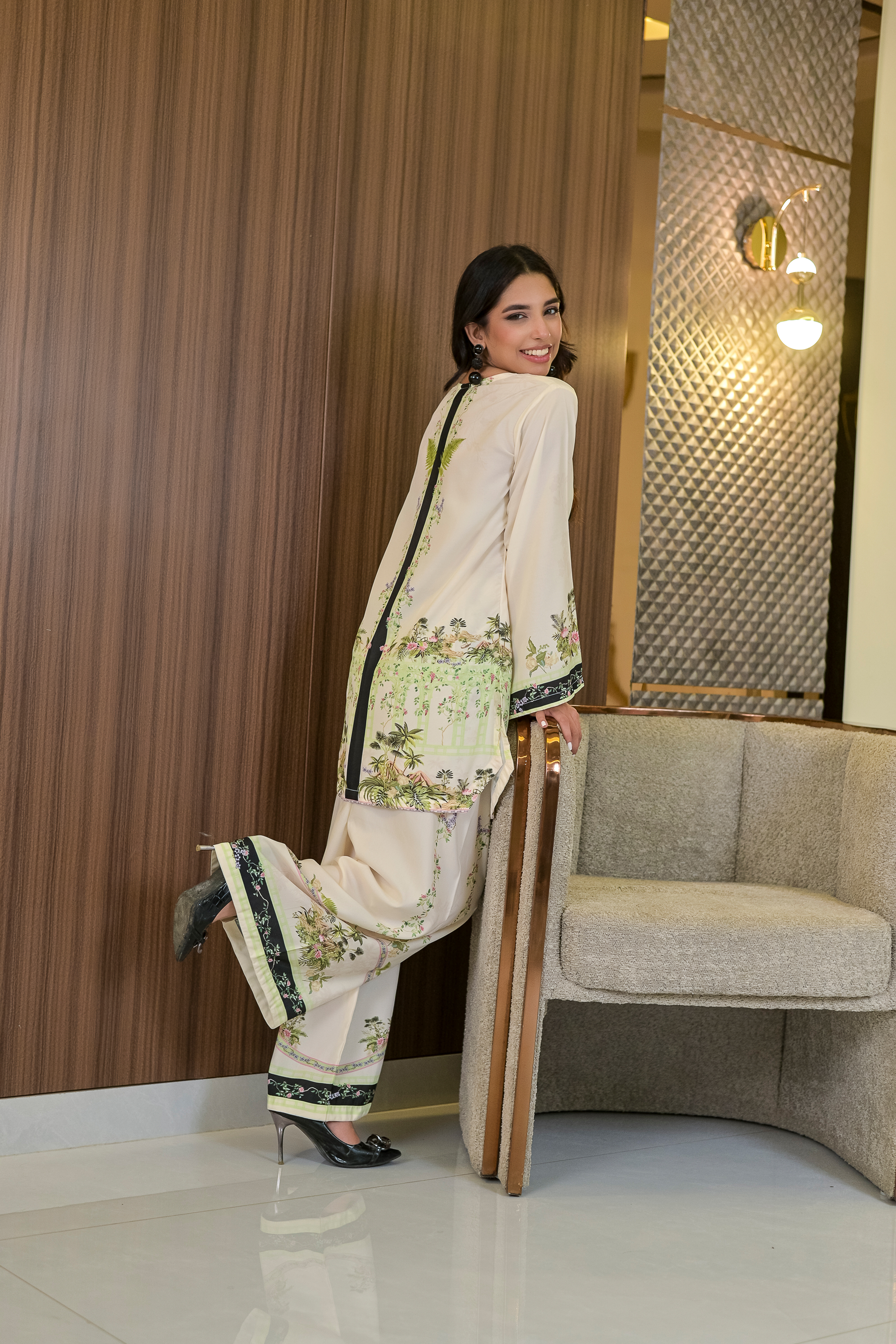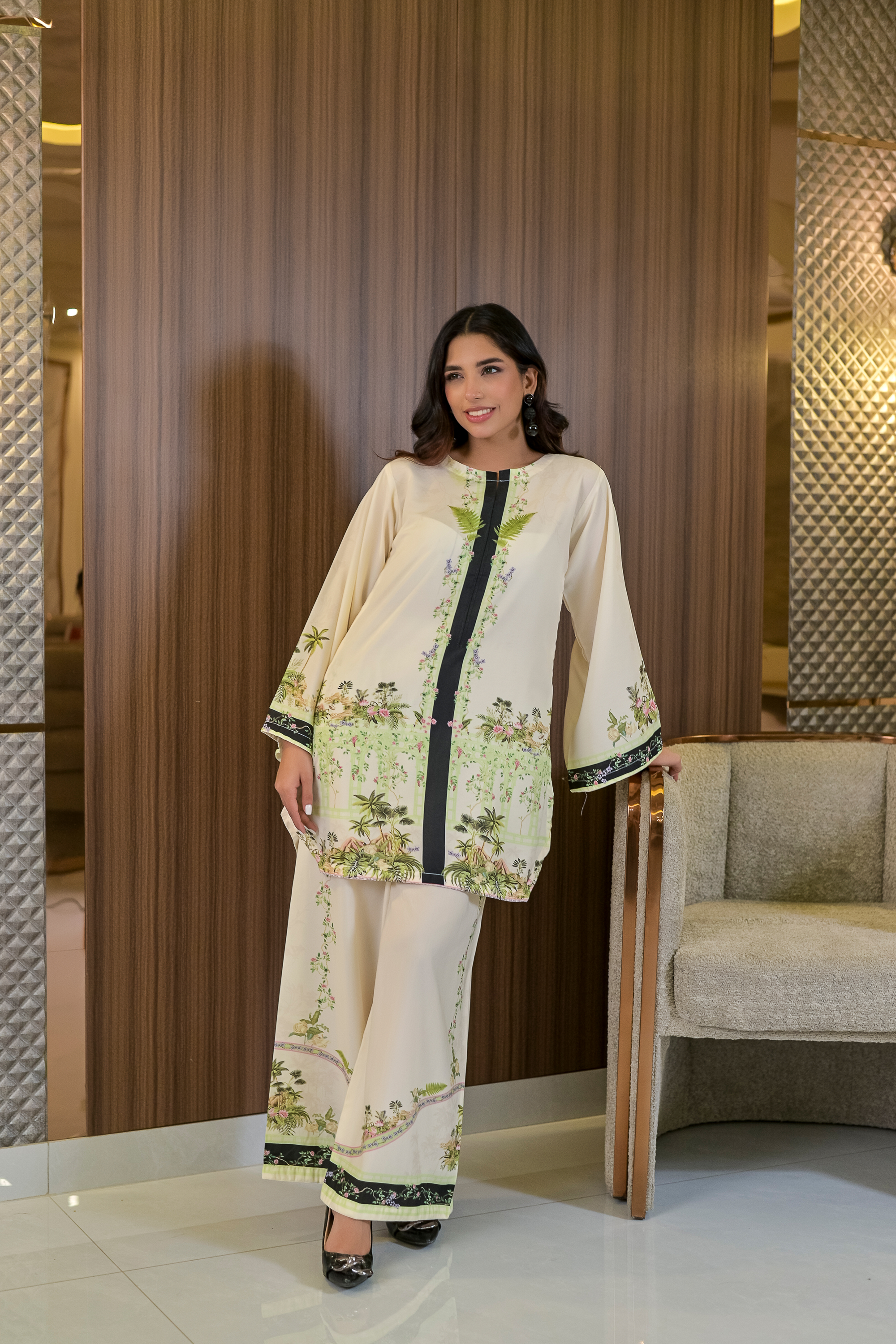Vanilla Green blends subtle elegance with a fresh, nature-inspired touch. Set against a soft vanilla-cream base, the outfit is accented with deep green borders and delicate botanical prints. Crafted from lightweight blended raw silk, this 2-piece stitched set features a straight-cut shirt with wide sleeves and coordinating trousers. Balanced, graceful, and refreshing—perfect for understated yet stylish daywear.